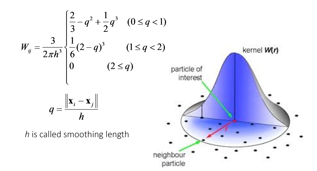 因此在SPH中利用核函数(kernel)来做进一步的加权。当粒子离计算位置比较远时它的权重会比较低,而当粒子距离计算位置比较近时则会具有相对较高的权重。