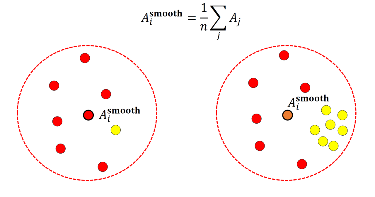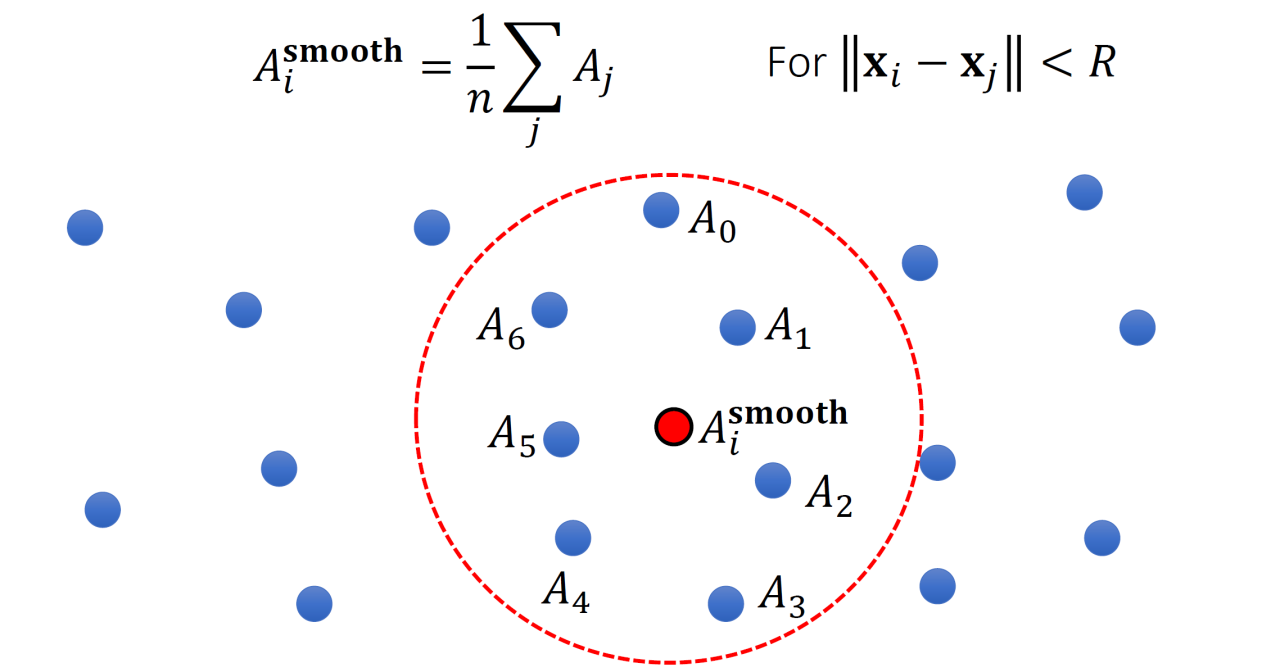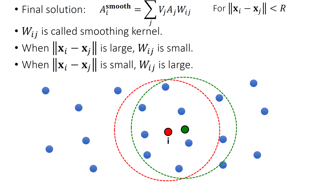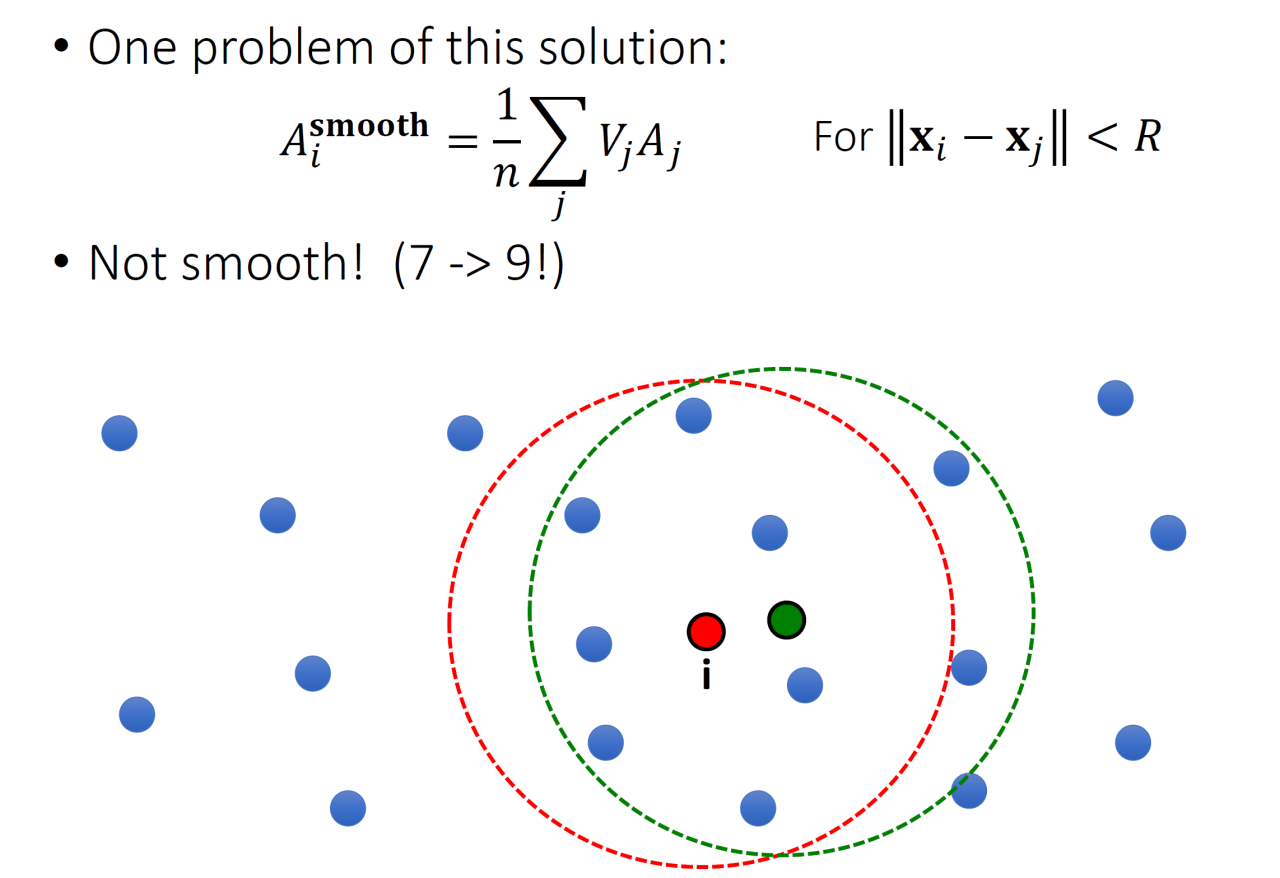 但是这种加权方法仍然有一些问题,实际上利用体积进行加权后得到的函数可能是不够光滑的。考虑红色和绿色两个位置的函数值,尽管它们在空间上是临近的但由于绿色位置考虑了更多的粒子,它的函数值可能要比红色位置大得多。