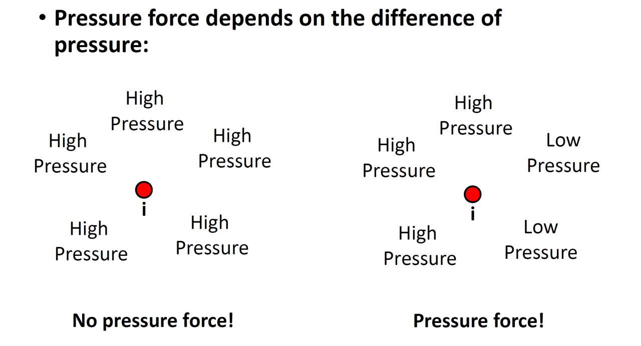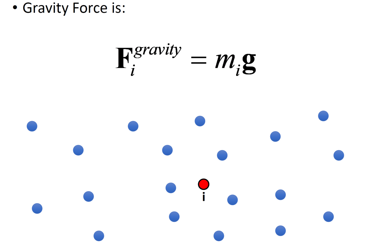 在SPH中我们需要更新每个粒子的状态来实现流场的仿真。对于每个粒子需要考虑3个方面的外力:重力(gravity force)、压力(pressure force)以及粘滞力(viscosity force)。