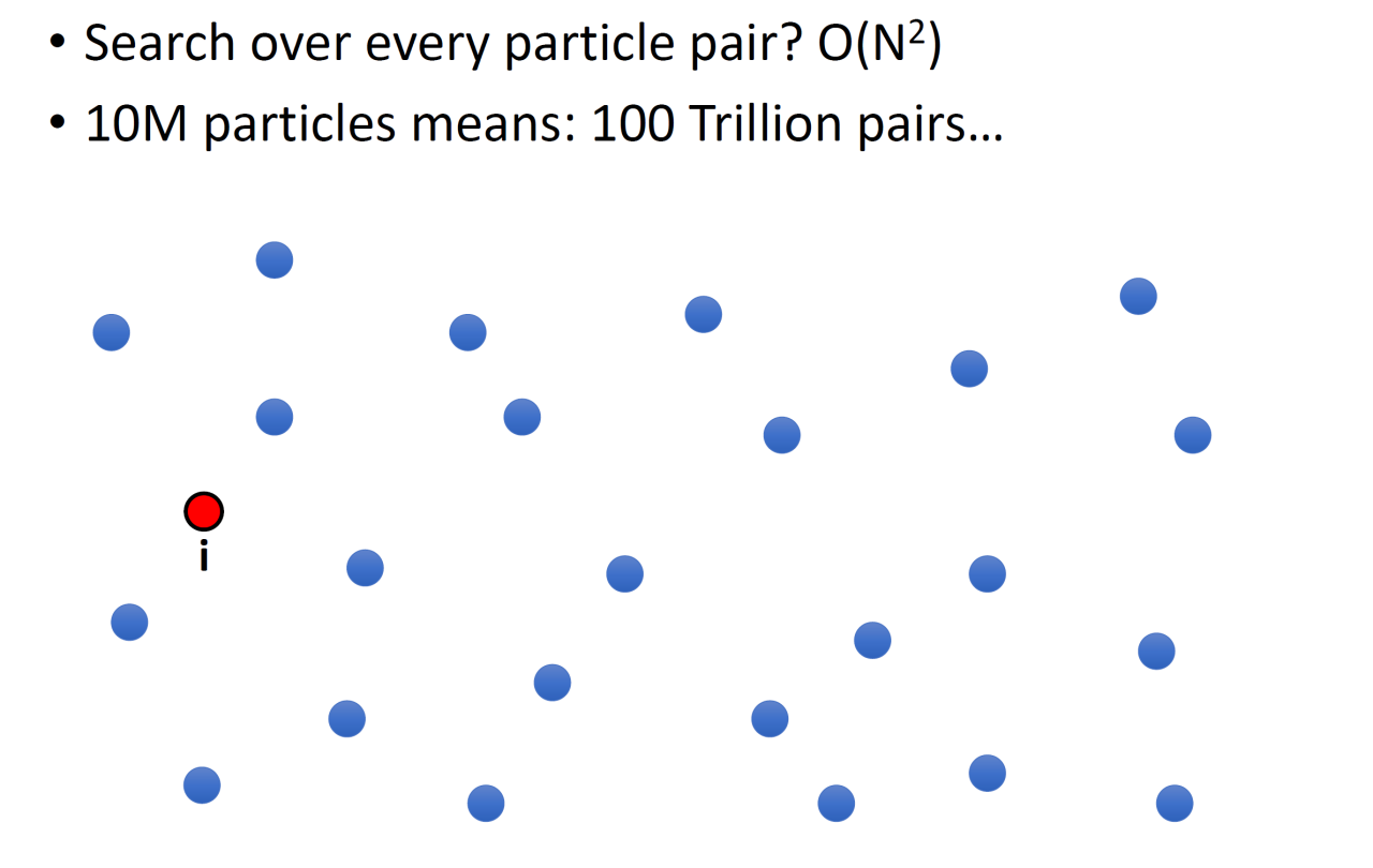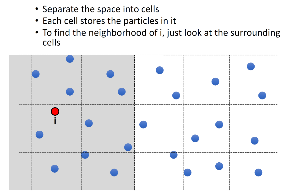 不难发现SPH进行仿真时查询每个粒子的邻域会占用大量的计算资源。如果使用暴力计算的话它的计算复杂度为\(O(N^2)\),这对于大规模粒子系统的仿真是不可接受的。