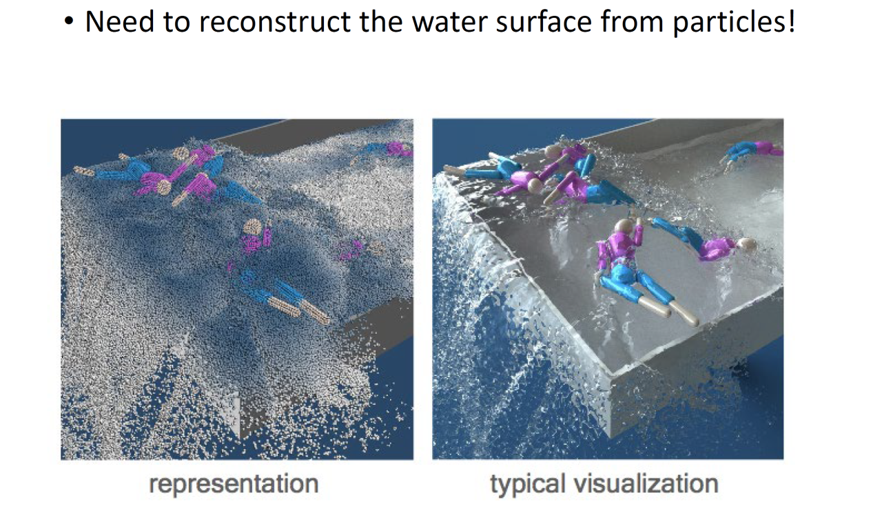 最后需要说明的是目前市面上的渲染器是无法直接对粒子进行渲染的。因此要对流体进行可视化需要首先将粒子重建为网格,或者是将粒子系统转换为SDF才能进行渲染。