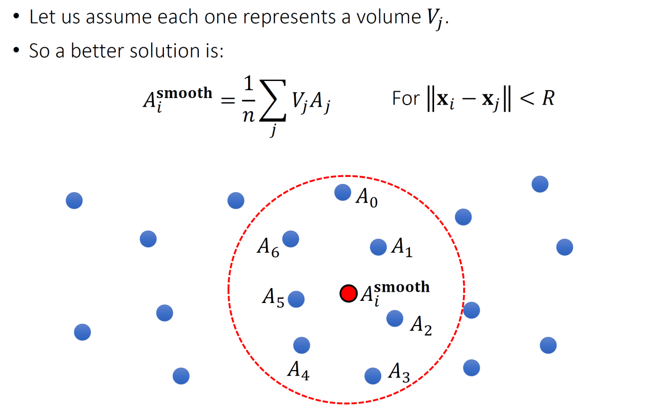 因此更好的方法是使用加权的方式来计算平均。假设每个粒子都具有一定的体积\(V_j\),我们可以利用体积来对不同粒子携带的物理量进行加权。