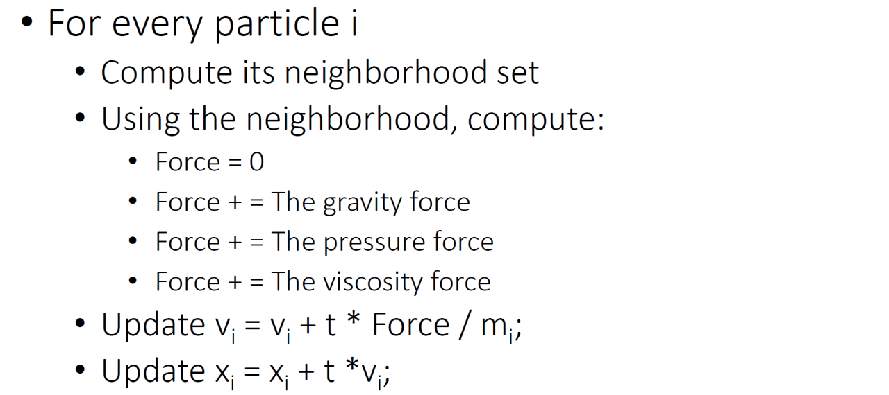 我们把以上几种力施加到粒子上并按照粒子系统进行更新就得到了SPH的模拟算法: