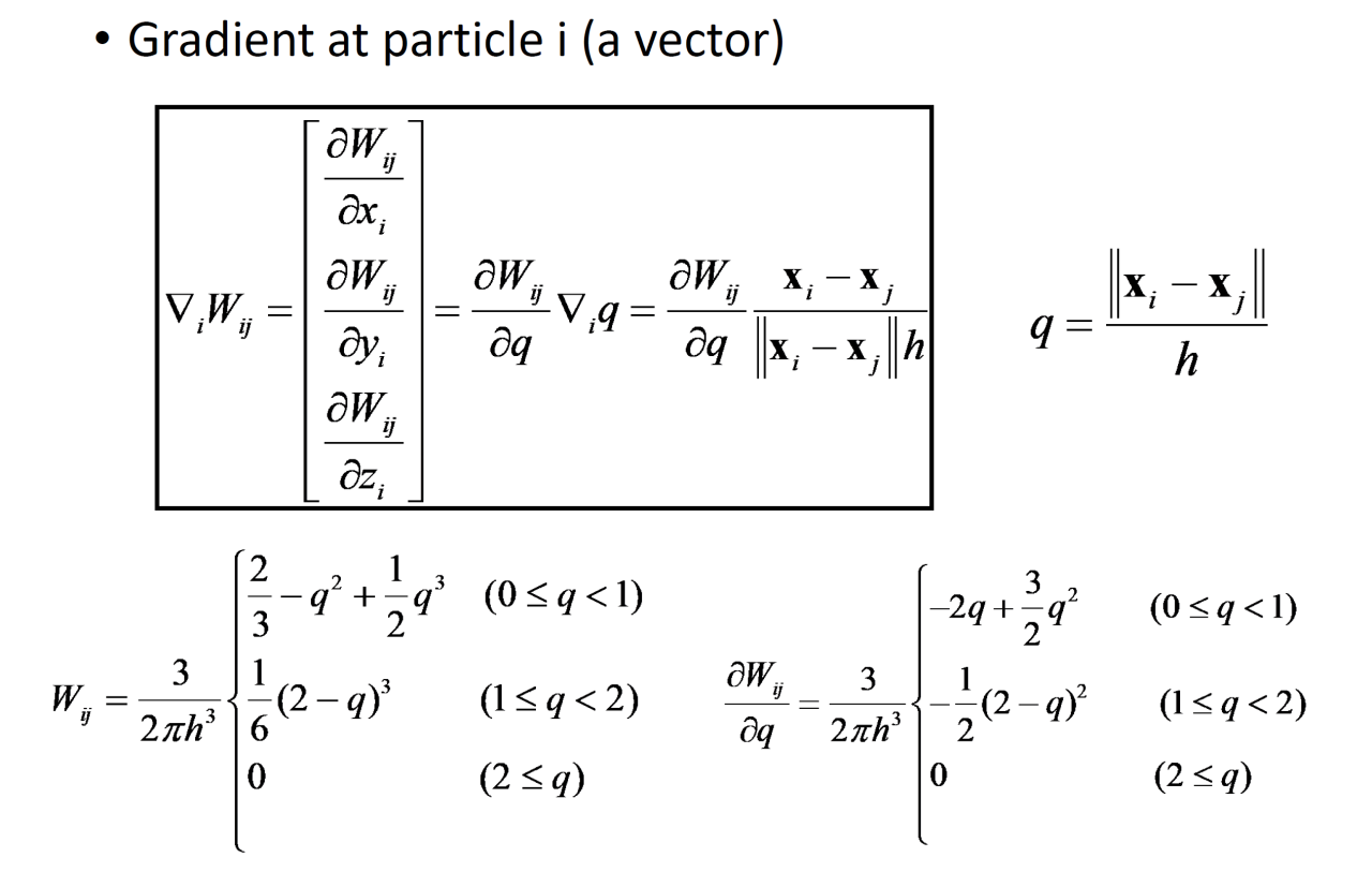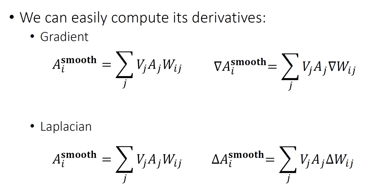 使用核函数的另一个好处在于我们可以把对流场的求导转换为对核函数的求导。这里我们假设每个粒子携带的物理量和它的体积为常量,这样流场的导数为核函数导数的加权和: