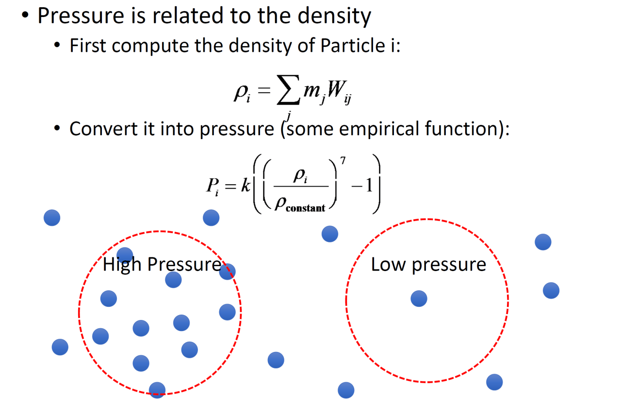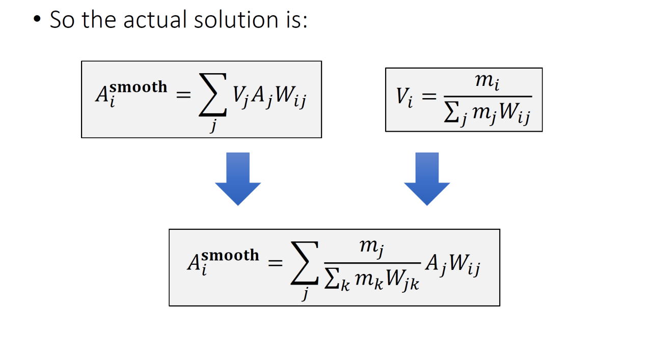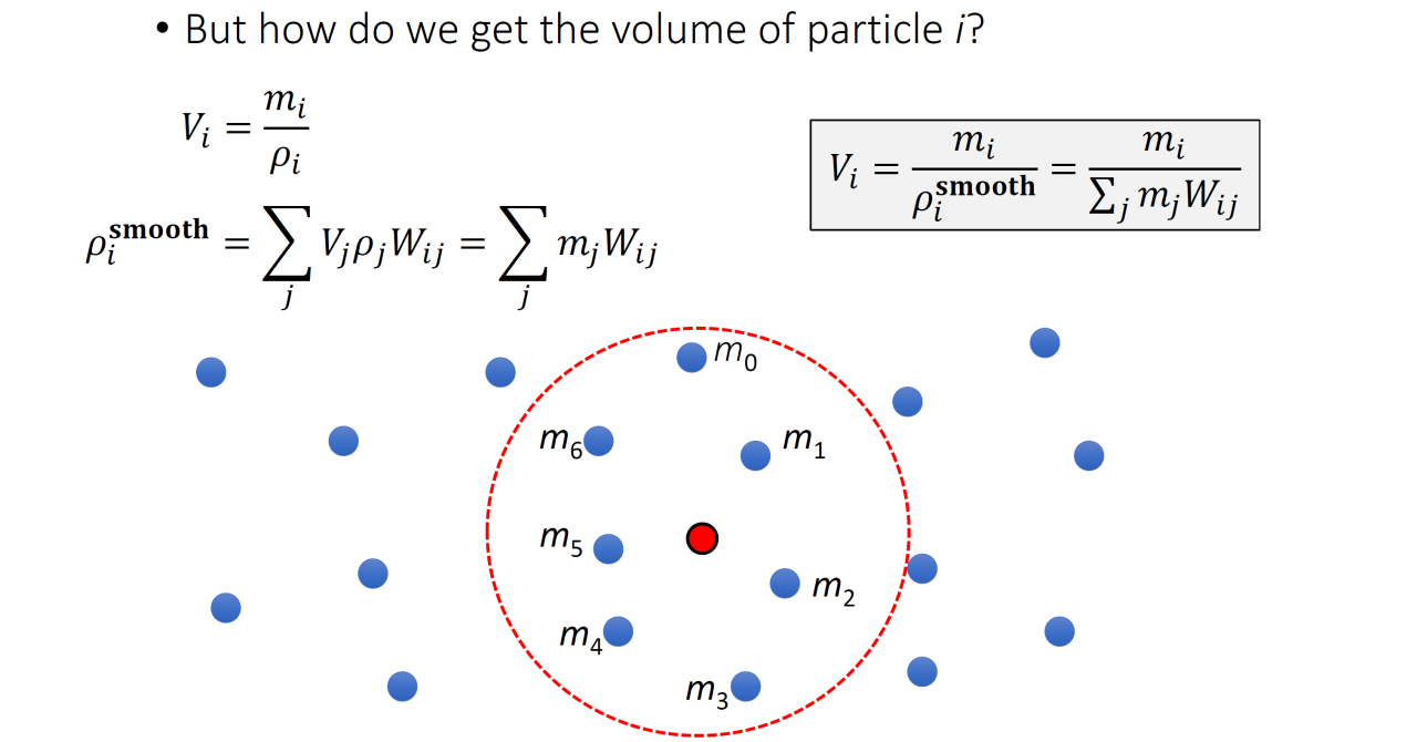 那么怎么计算粒子的体积呢?实际上我们可以通过类似的方式来更新粒子的体积。对于每个单独的粒子,它的体积由质量除以密度来表示。当粒子不断运动时空间中的粒子分布会发生变化,因此同样可以通过加权平均的方法来估计当前时刻粒子的密度,进而更新粒子的体积。
