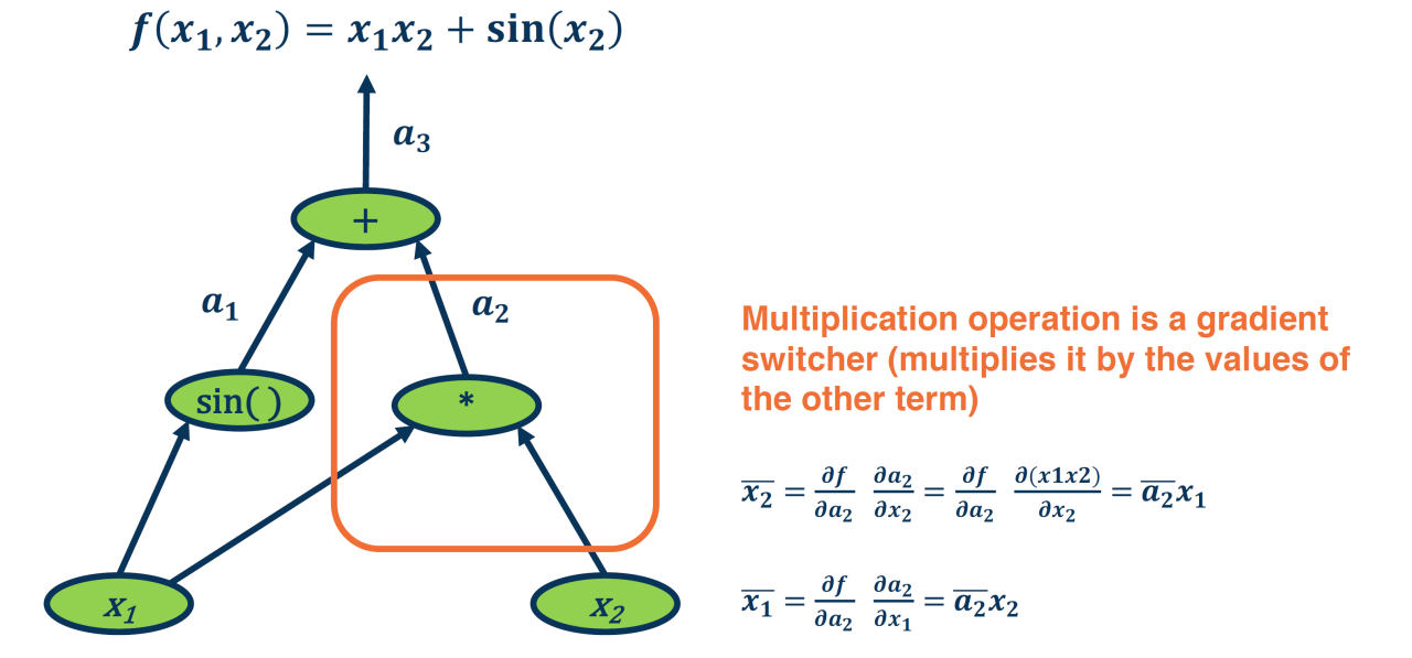 对于相乘运算,每个参与节点接收到的导数等于相乘后的导数乘以另一个参与节点。