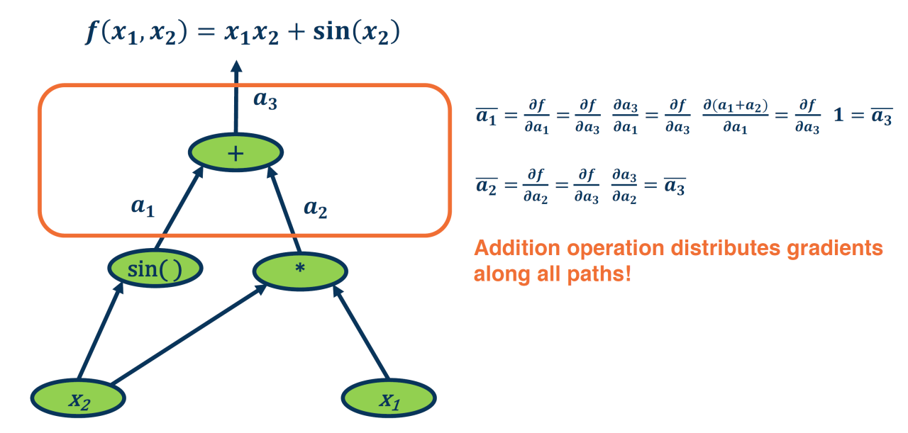 在进行反向计算时不同的运算有着不同的传播模式。对于相加运算,它会把自身的导数直接复制给所有参与计算的节点。