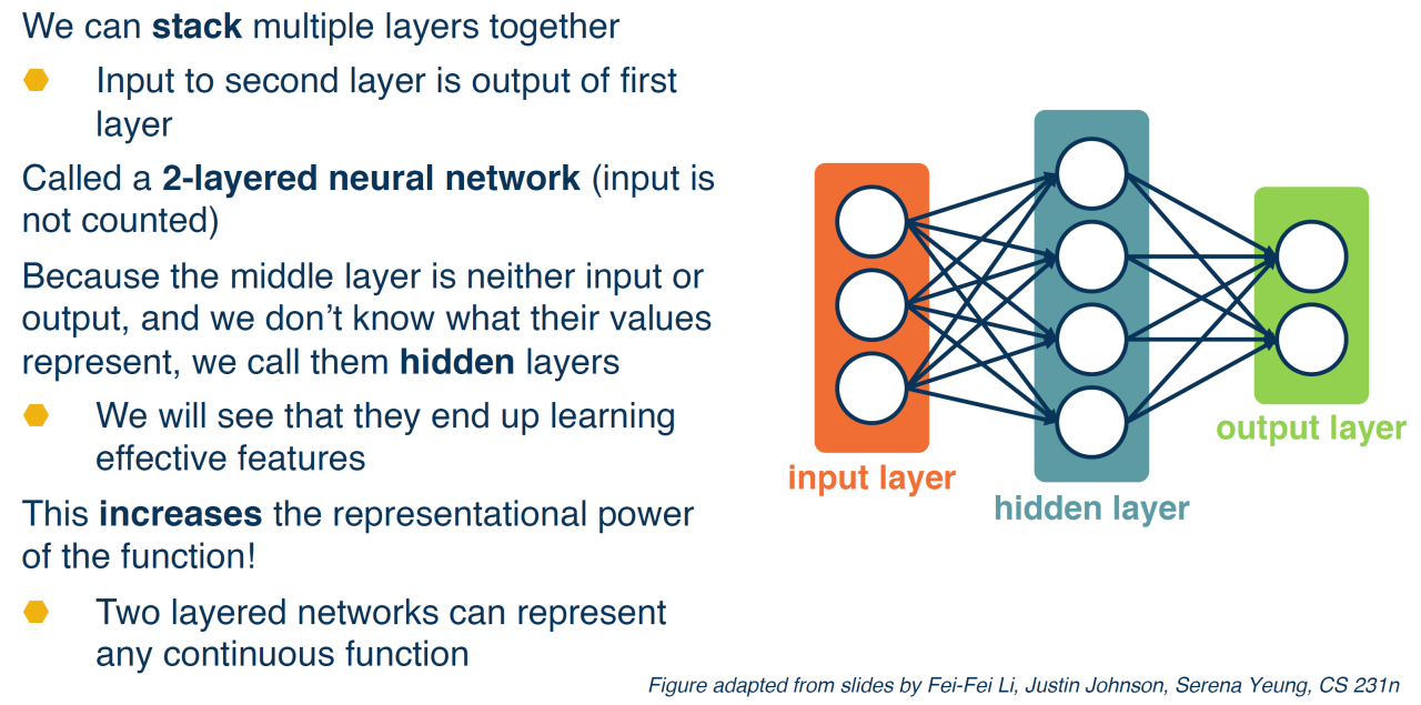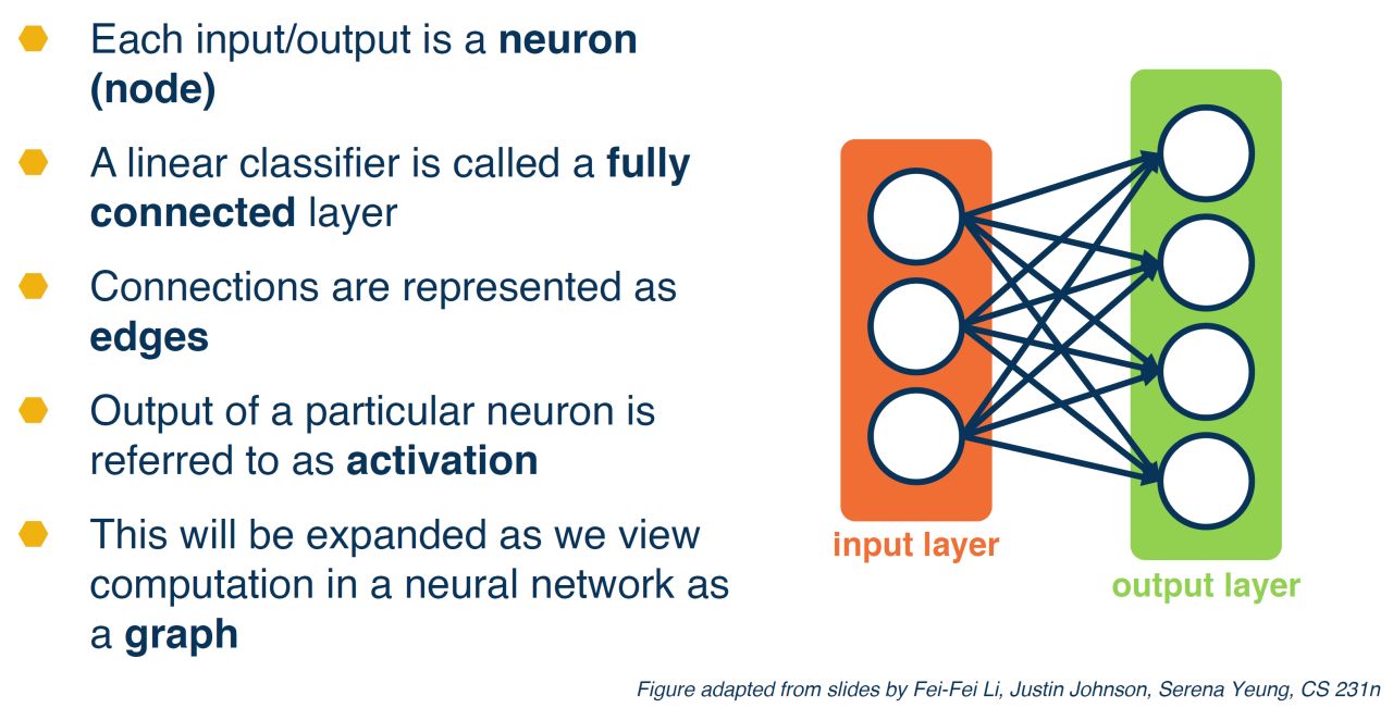 我们还可以通过一张图来表示神经网络:每个神经元对应层输入/输出层的一个节点,神经元之间的连接则构成了图的边。同时不难发现,基本的线性分类器等价于将输入层和输出层直接相连的神经网络,当然还需要去除掉输出层的激活函数。
