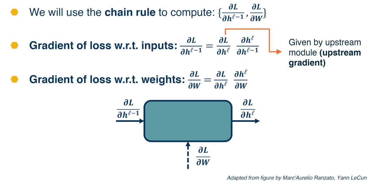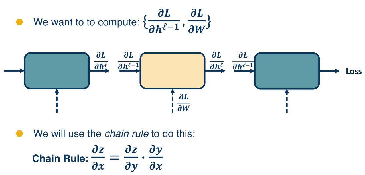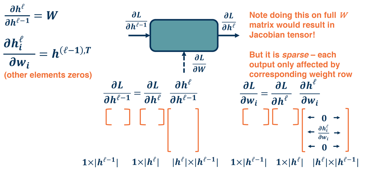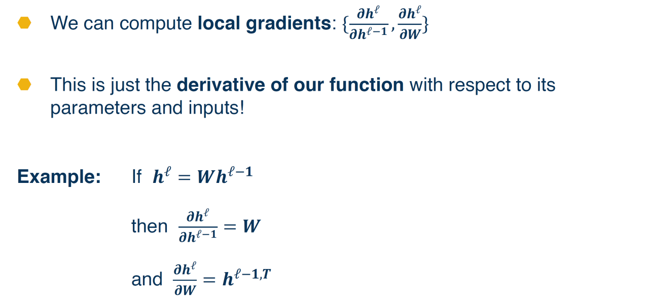 然后考虑损失函数关于其它层的导数。实际上我们不会直接计算损失函数对于某一层的导数,而是首先计算该层的输出关于输入以及参数的导数$\frac{\partial h^l}{\partial h^{l-1}}$、$\frac{\partial h^l}{\partial W}$。由于计算图上每一层都是可导的,我们可以解析地计算这些局部导数。