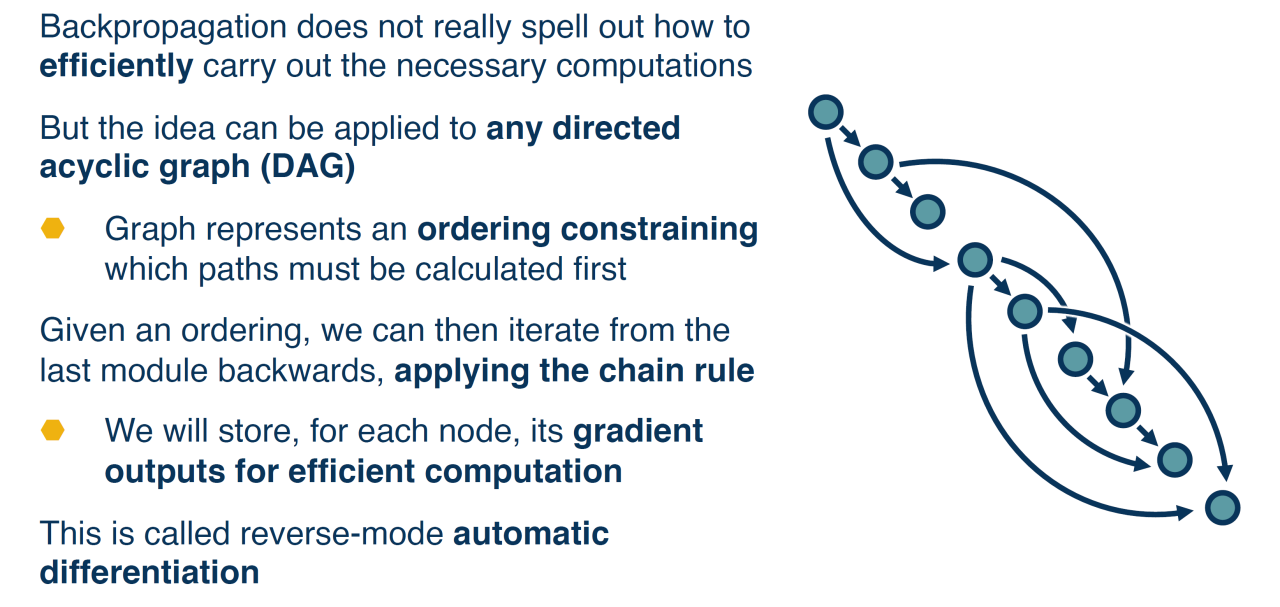 反向传播算法不仅仅适用于链式模型,实际上对于任意拓扑结构的计算图只要它是有向无环图(directed acyclic graph, DAG)都可以利用反向传播来计算导数。这种利用图的结构以及链式法则来计算导数的方法称为自动微分(automatic differentiation)。