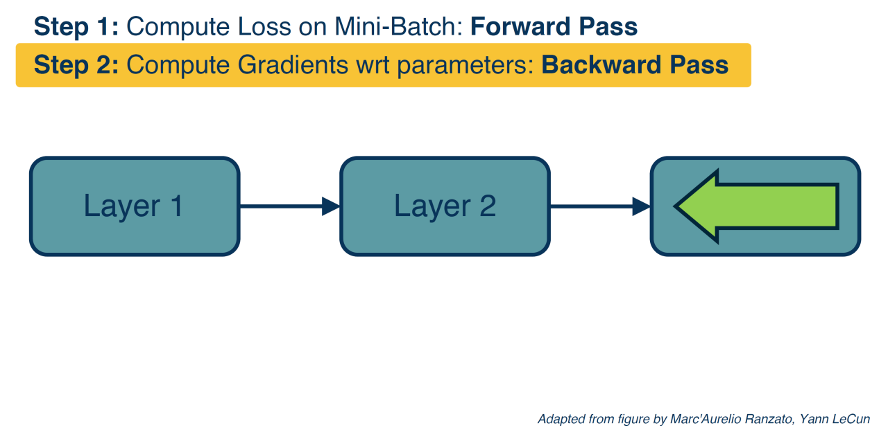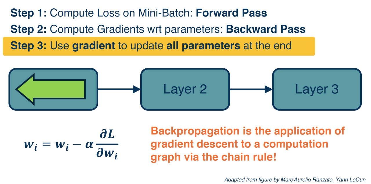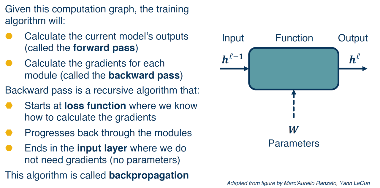 对于给定的计算图,模型的训练包括前向计算(forward pass)和反向计算(backward pass)两个步骤。在前向计算中,我们把数据带入到图上的输入节点并依次计算节点的输出,然后在反向计算中从损失函数出发从后向前计算损失函数的导数。这个算法称为反向传播(backpropagation)算法。