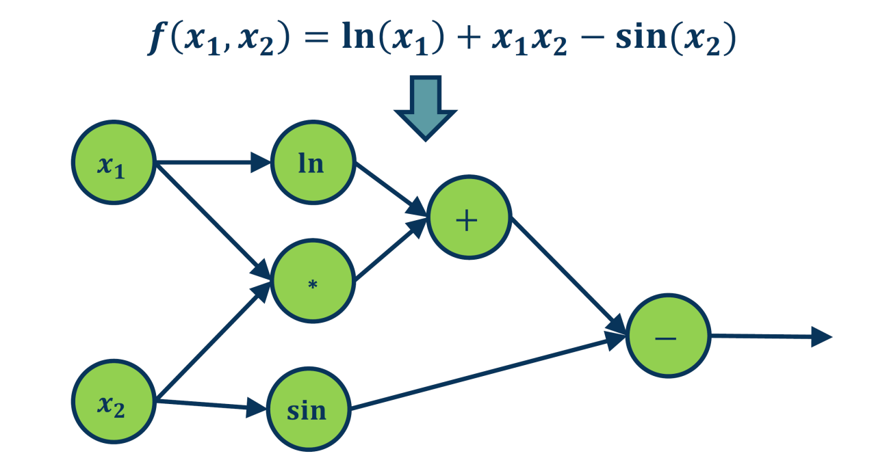 举一个简单的例子,我们可以把$f(x_1, x_2) = x_1 x_2 + \sin (x_2)$等价地表示为包含两个输入节点和一个输出节点的计算图如下: