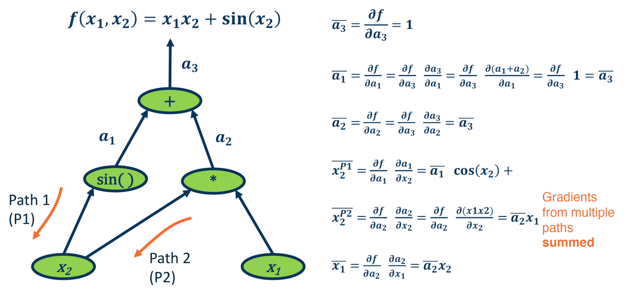 在计算导数时在每个节点上将后一层节点传过来的导数以及自身的局部导数相乘即可获得所需的导数。还需要注意的一点是在反向计算时每个节点需要把所有的路径上的导数相加才是输出关于当前节点的导数。