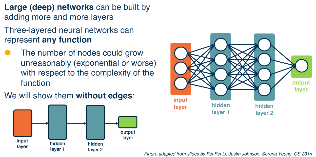 显然增加隐层的数量可以提高神经网络的表达能力,但实际上简单的三层神经网络就足以描述任何连续的函数,这称为通用逼近定理(universal approximation theorem)。需要说明的是尽管理论上三层的神经网络可以近似任何形式的连续函数,对于复杂的情况可能需要指数级或是更多数量的神经元才能进行近似,同时训练这样的大型网络也往往是更加困难的。因此层数更深的网络要比神经元更多的网络有着更加广泛的应用。
