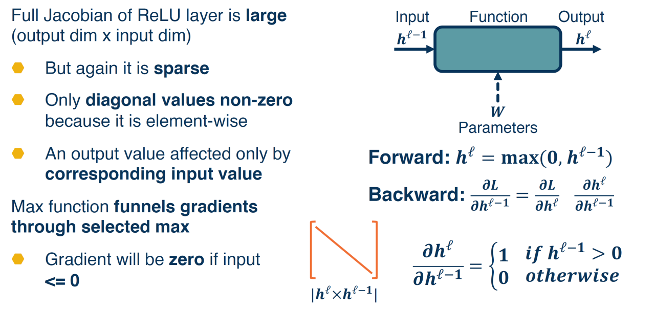 类似地,激活函数在反向计算时也需要进行向量化。由于前向计算时是对每个元素单独进行的计算,因此局部的导数矩阵是一个稀疏的对角矩阵。利用这一点同样可以提高反向计算时的效率。