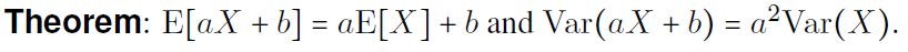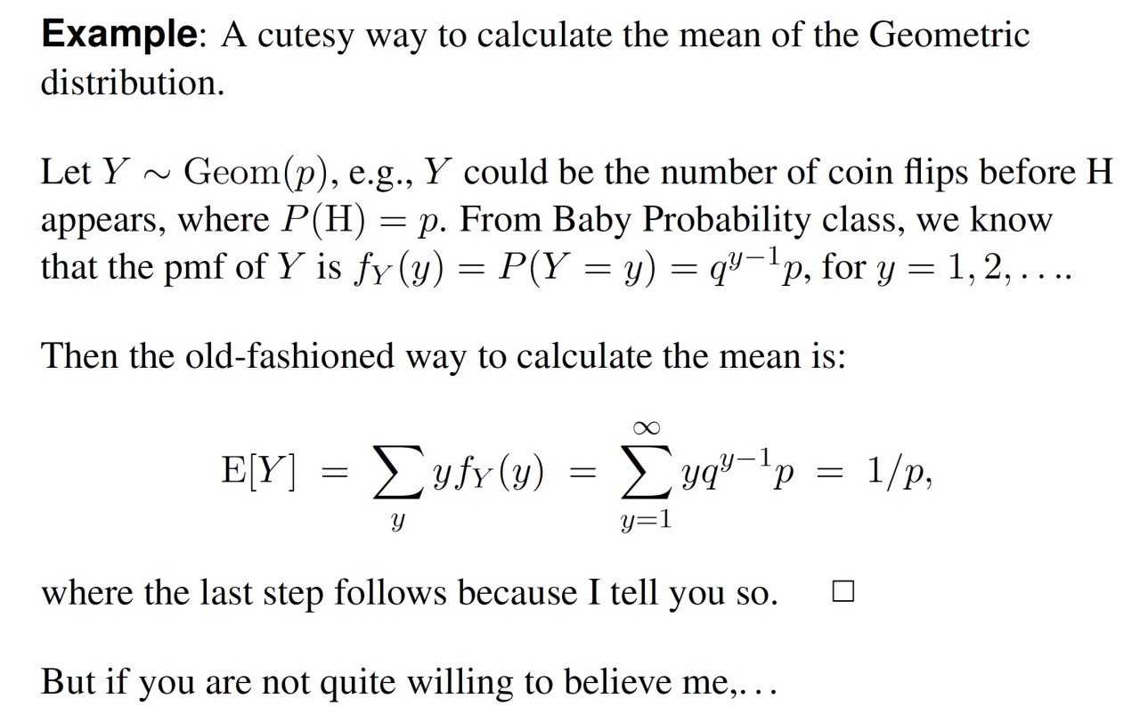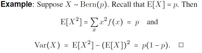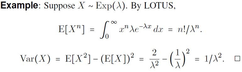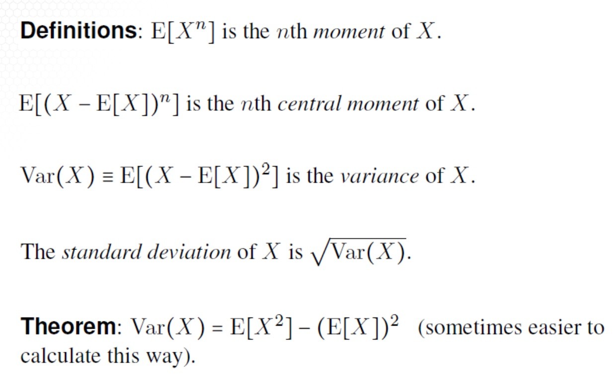 函数$h(X)$可以是任意形式,而对于幂函数我们称对应的期望为$X$的n阶矩($n$th moment of $X$)。除了幂函数我们还可以利用LOTUS来定义n阶中心矩($n$th central moment of $X$)和方差(variance):