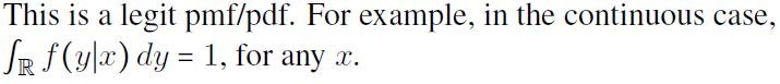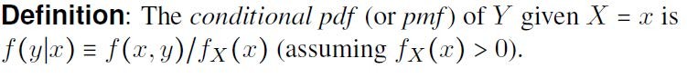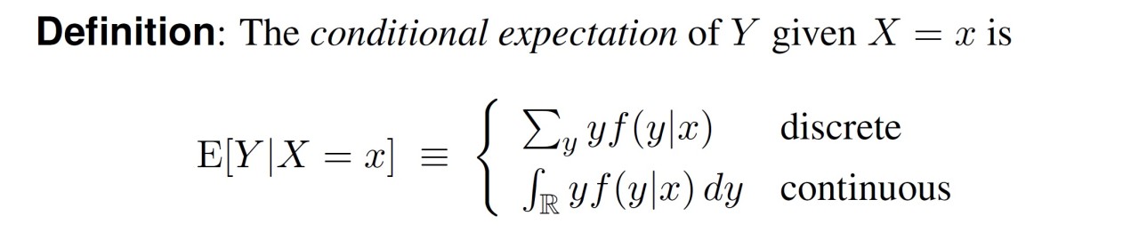 在条件概率的基础上我们可以定义条件期望(conditional expectation)。条件期望$E[Y \vert X]$可以理解为一个关于随机变量$X$的函数,它是$Y$在条件概率$f(Y \vert X)$下的期望。
