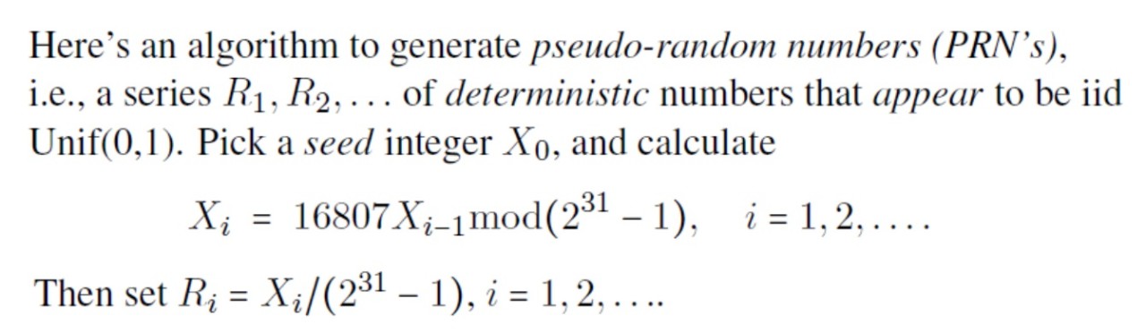 \[X = - \frac{1}{\lambda} \ln (1 - U), \ U \sim \text{Unif} (0, 1)\]对于逆变换方法我们需要生成(0, 1)区间上的均匀分布的随机数,我们可以利用上节课介绍的伪随机数生成算法来实现: