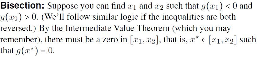 在很多时候我们需要去计算函数的零点。对于复杂的函数可能无法解析地求得函数的零点,在这种情况下需要使用一些数值计算方法来求解。最基本的方法是二分法(bisection):