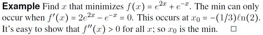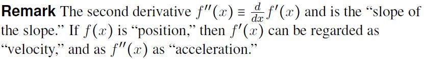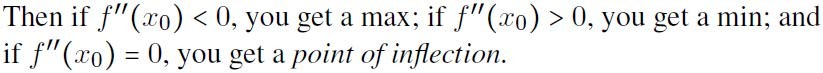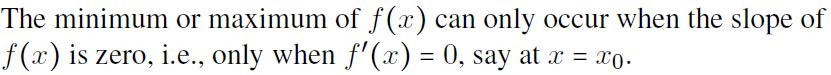 \[[a f(x) + b]' = a f'(x)\] \[[f(x) + g(x)]' = f'(x) + g'(x)\] \[[f(x) g(x)]' = f'(x) g(x) + f(x) g'(x)\] \[\bigg[ \frac{f(x)}{g(x)} \bigg]' = \frac{g(x) f'(x) - f(x) g'(x)}{g^2 (x)}\] \[[f(g(x))]' = f'(g(x)) g'(x)\]函数$f(x)$仅在其导数为0的位置取极值,而借助于二阶导数我们还可以进一步判断极值点的类型。