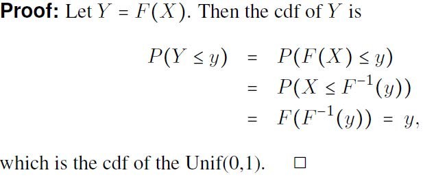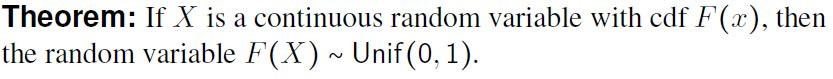 那么如何使用计算机来产生各种类型的随机变量呢?对于任意连续型随机变量$X$我们可以通过它的CDF来进行采样,实际上$F(X)$服从(0, 1)区间上的均匀分布: