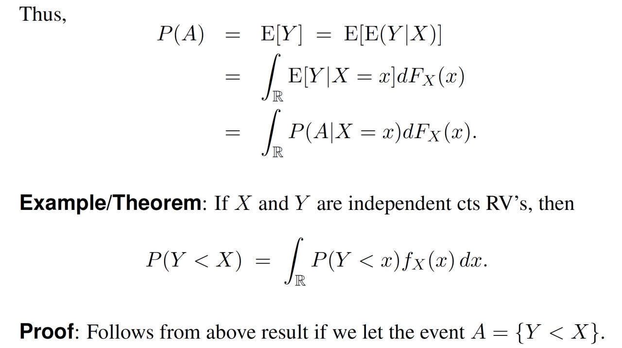 条件期望的一个重要应用是利用条件期望$E[Y \vert X]$来计算$Y$自身的期望,这称为全期望定理(law of total expectation)。