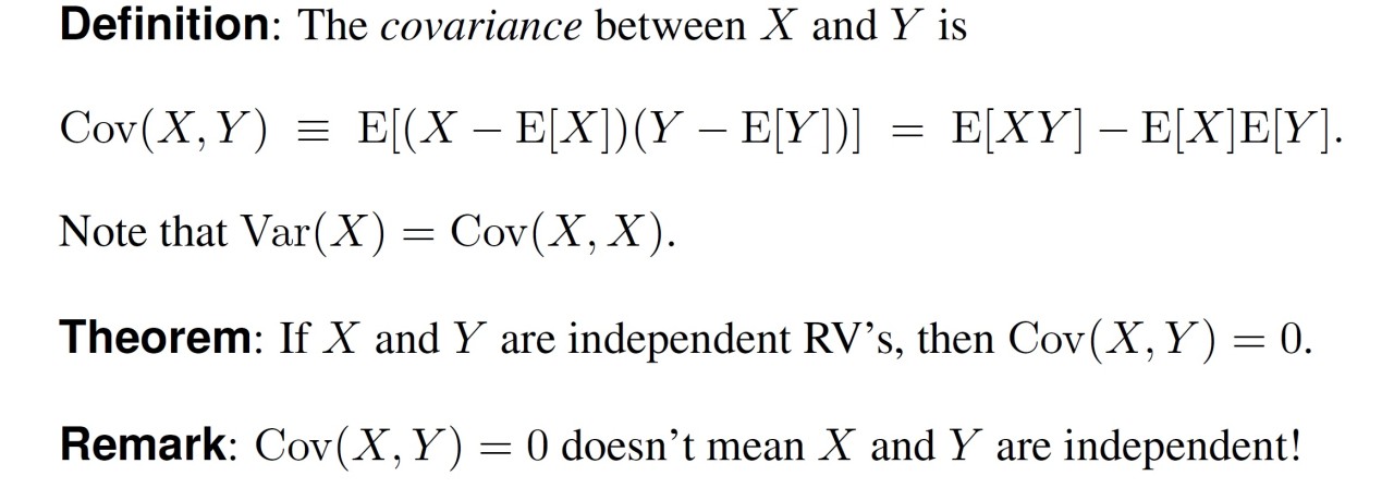 在LOTUS的基础上就可以定义多元随机变量的协方差(covariance),它描述了随机变量之间的相关性。不过需要注意的是协方差为0并不表示随机变量相互独立。