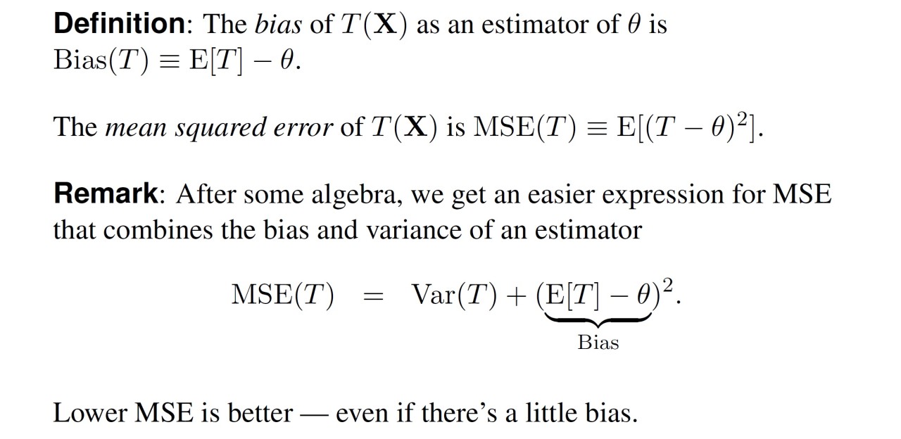 由于方差的存在有时无偏估计也不是一个好的估计。我们定义估计值与真实值之间平方差的期望为平均平方误差(mean squared error, MSE),它度量了估计值与真实值之间的误差。