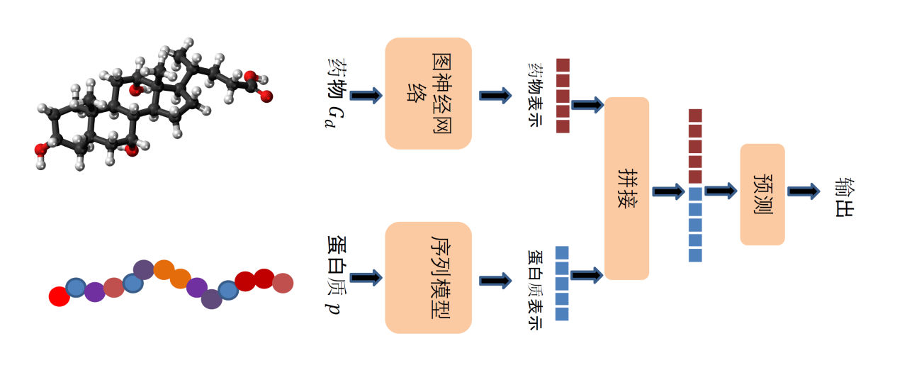 药物-蛋白质相互作用的识别对于所需后续药物的搜索范围直观重要。类似于上面介绍过的化学分子表示学习和蛋白质相互作用界面预测,我们可以将药物的分子式利用图神经网络来表示从而获得整个分子的嵌入,而对于蛋白质则可以利用序列模型或者图神经网络来获得蛋白质的表示。得到它们的特征向量后将两个特征向量拼接起来再利用全连接层进行预测即可。