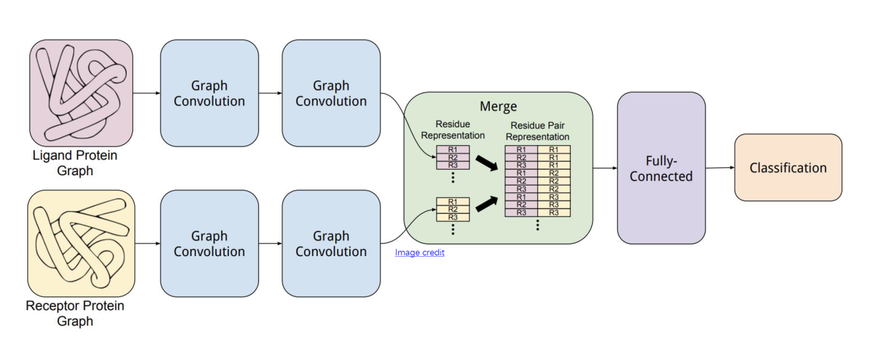 蛋白质是具有生化功能的氨基酸链。每个蛋白质为了实现它们的功能需要与其它蛋白质相互作用,而预测这些相互作用发生的界面是一个比较困难的任务。蛋白质相互作用界面由相互作用的蛋白质中的氨基酸残基和附近的氨基酸残基组成,因此蛋白质相互作用界面的预测问题可以建模成一个以来自不同蛋白质的一对氨基酸残基作为输入的二分类问题。
