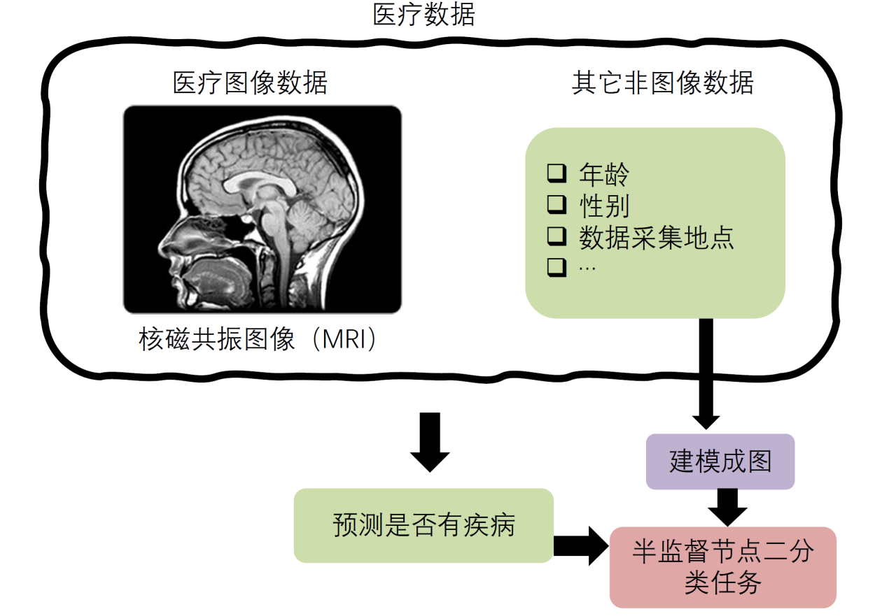 医疗数据通常包括图像、遗传和患者的行为数据,这些数据相互补充可以提高医生预测疾病的准确率。对于这些不同类型的数据,图提供了一种直观的方式来建模它们的关系。对于医疗图像数据,我们可以利用CNN来提取图像特征;而对于其它类型的则通过图神经网络来提取信息。最后我们把受试者作为图的节点,图像作为节点特征,受试者之间的关系作为图的边,这样整个疾病预测任务就可以看做是一种办结的节点二分类任务。