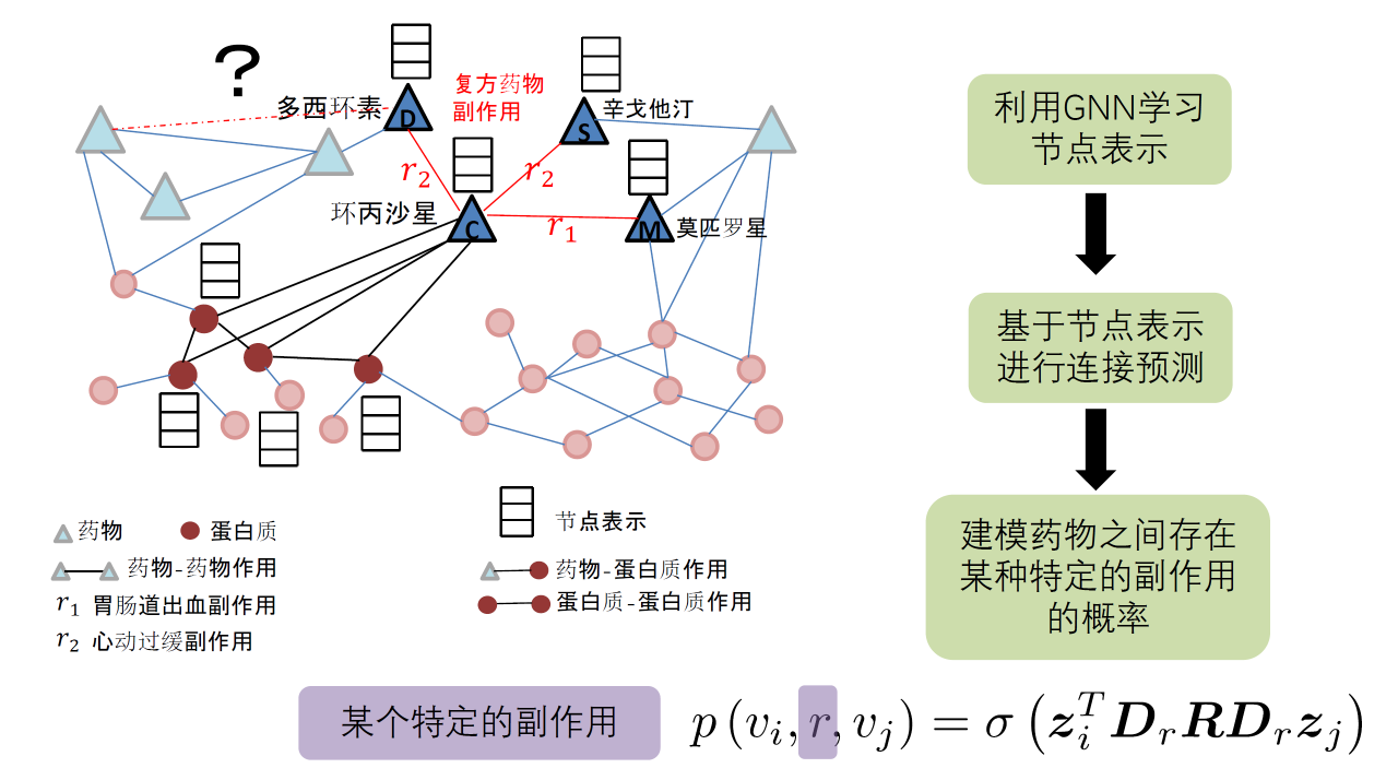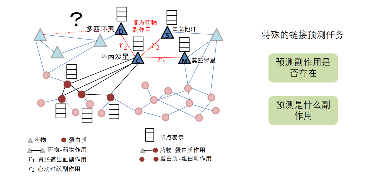 许多疾病不能够只通过单一的药物进行治疗,而是需要同时使用若干种药物。因此预测复方药物的副作用对于疾病治疗策略的制定有着重要的意义。研究表明,联合用药通常比随机配对的药物具有更多的靶蛋白,这意味着药物与靶蛋白直接的相互作用对复方药物建模有着重要意义。我们可以通过图神经网络引入药物-药物相互作用、药物-蛋白质相互作用以及蛋白质-蛋白质相互作用的多模态图,然后通过预测不同药物之间是否存在边以及存在何种类型的边来预测可能出现的副作用。