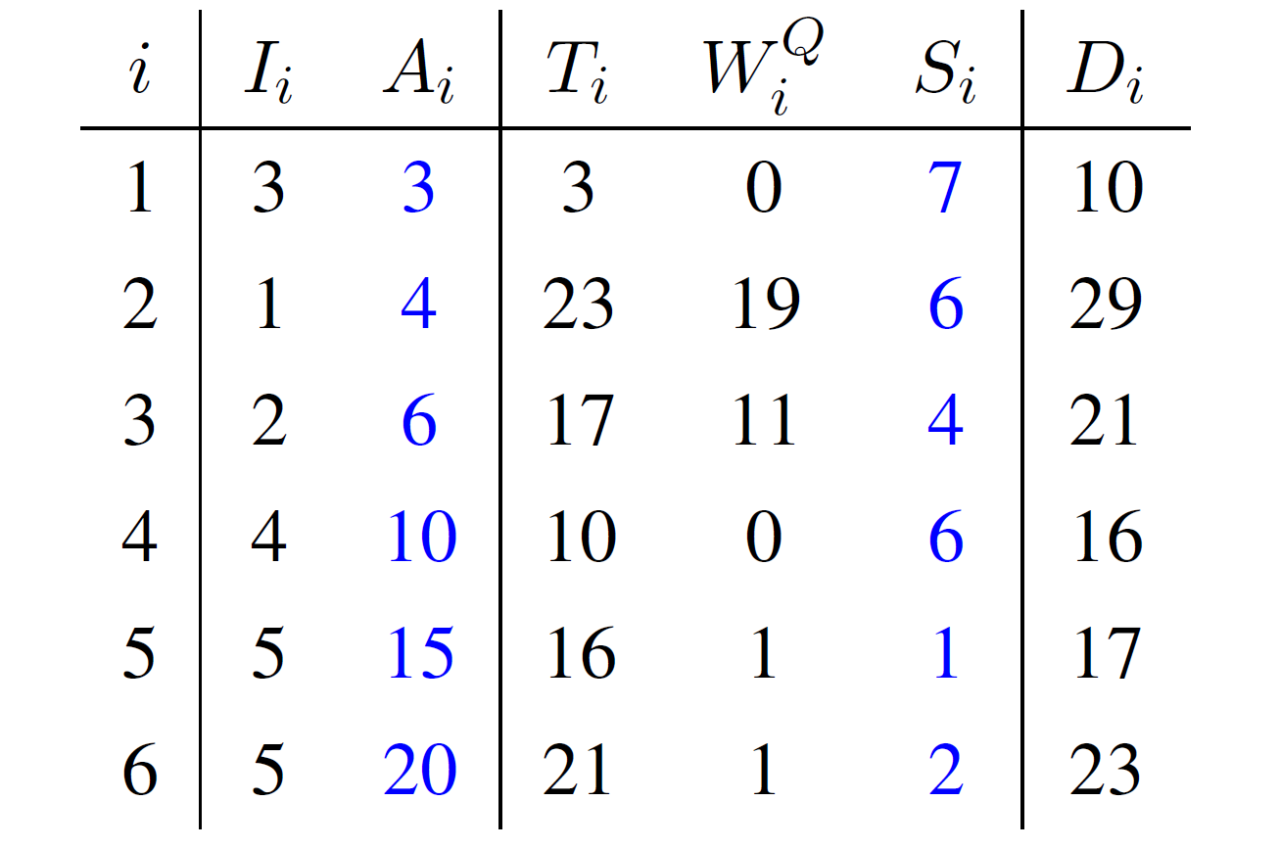 - 用户$i$的服务时刻为$T_i$,离开的时刻为$D_i$,它们满足$T_i = \max (A_i, D_{i-1})$