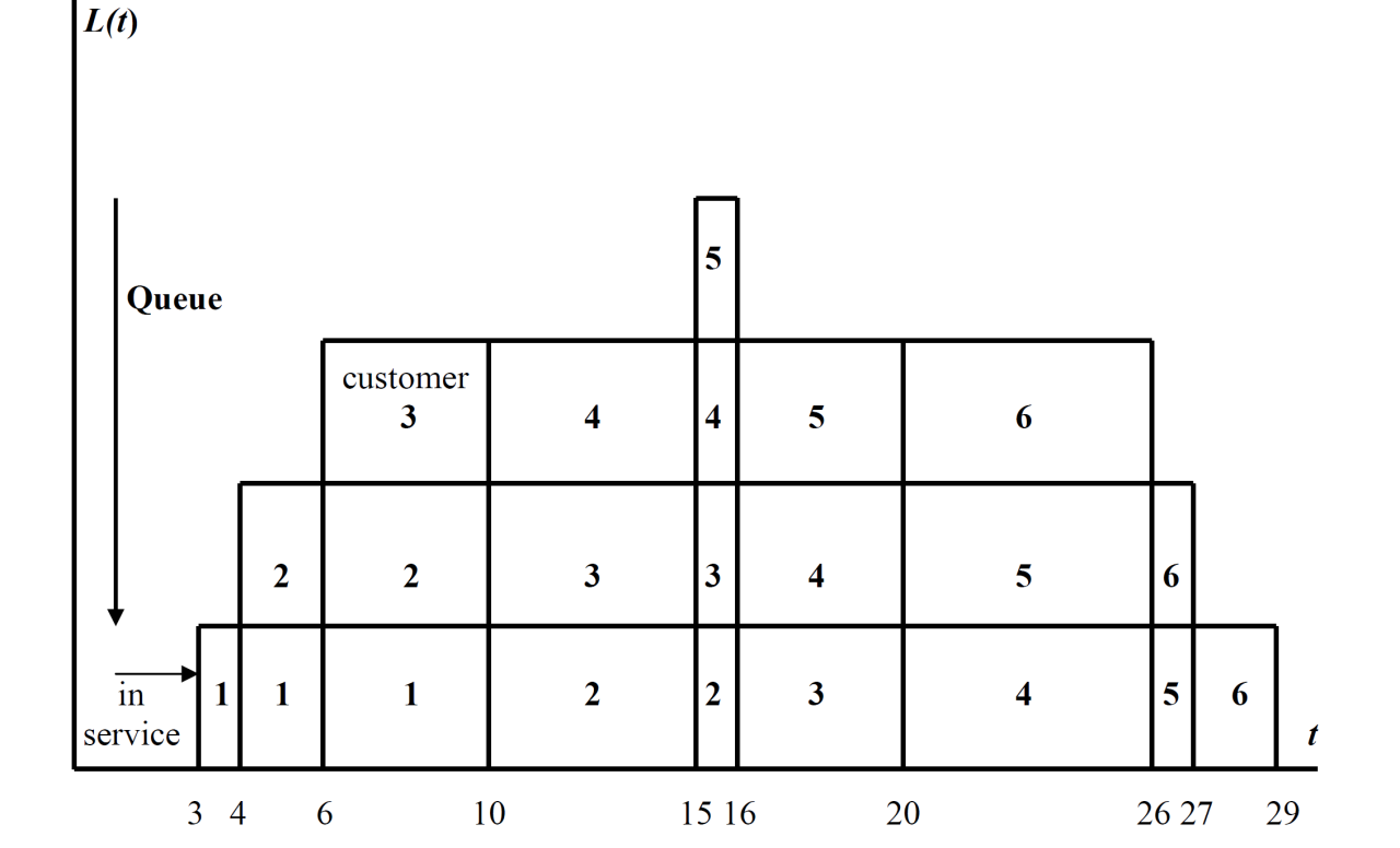 \[\bar{L} = \frac{1}{29} \int_0^{29} L(t) \ dt = \frac{70}{29}\]另一种计算$\bar{L}$的方法是对每个用户在系统中的时长进行求和然后再对时间进行平均: