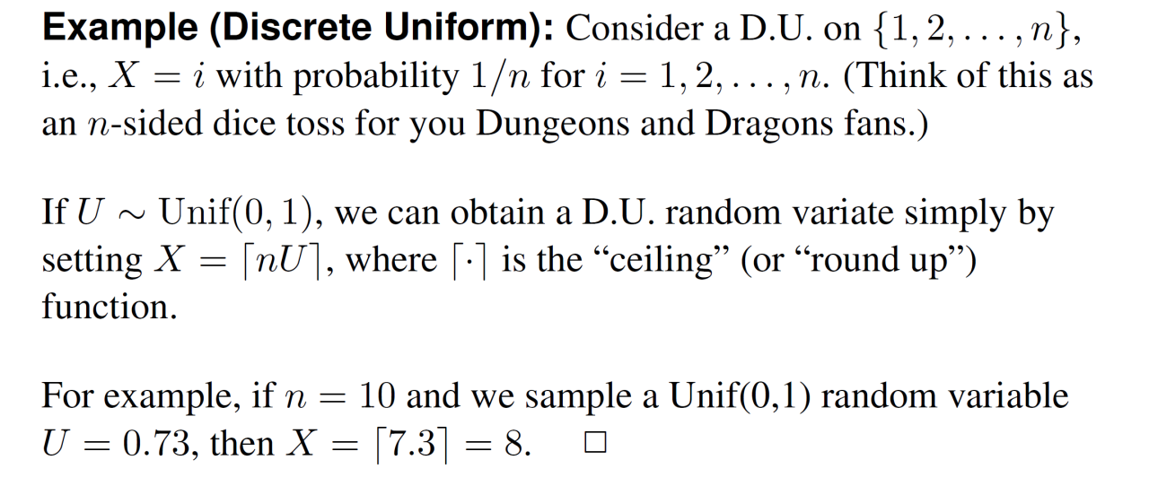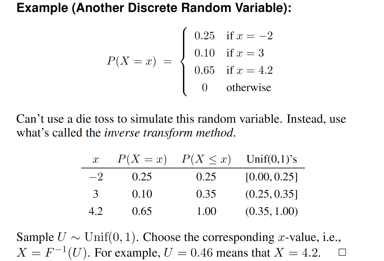 本节课最后讨论了模拟随机变量的方法。对于离散型随机变量我们可以通过对[0, 1]区间上的均匀分布进行采样,然后利用逆变换采样来生成离散变量。