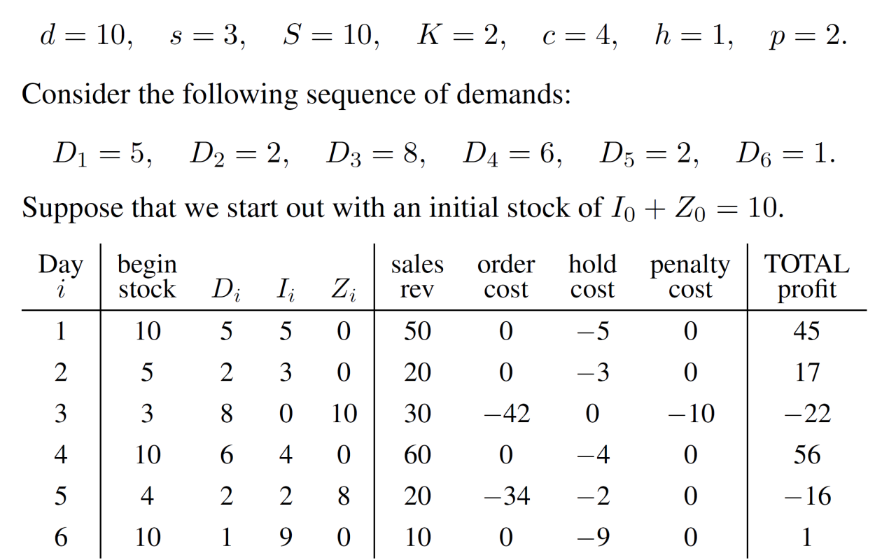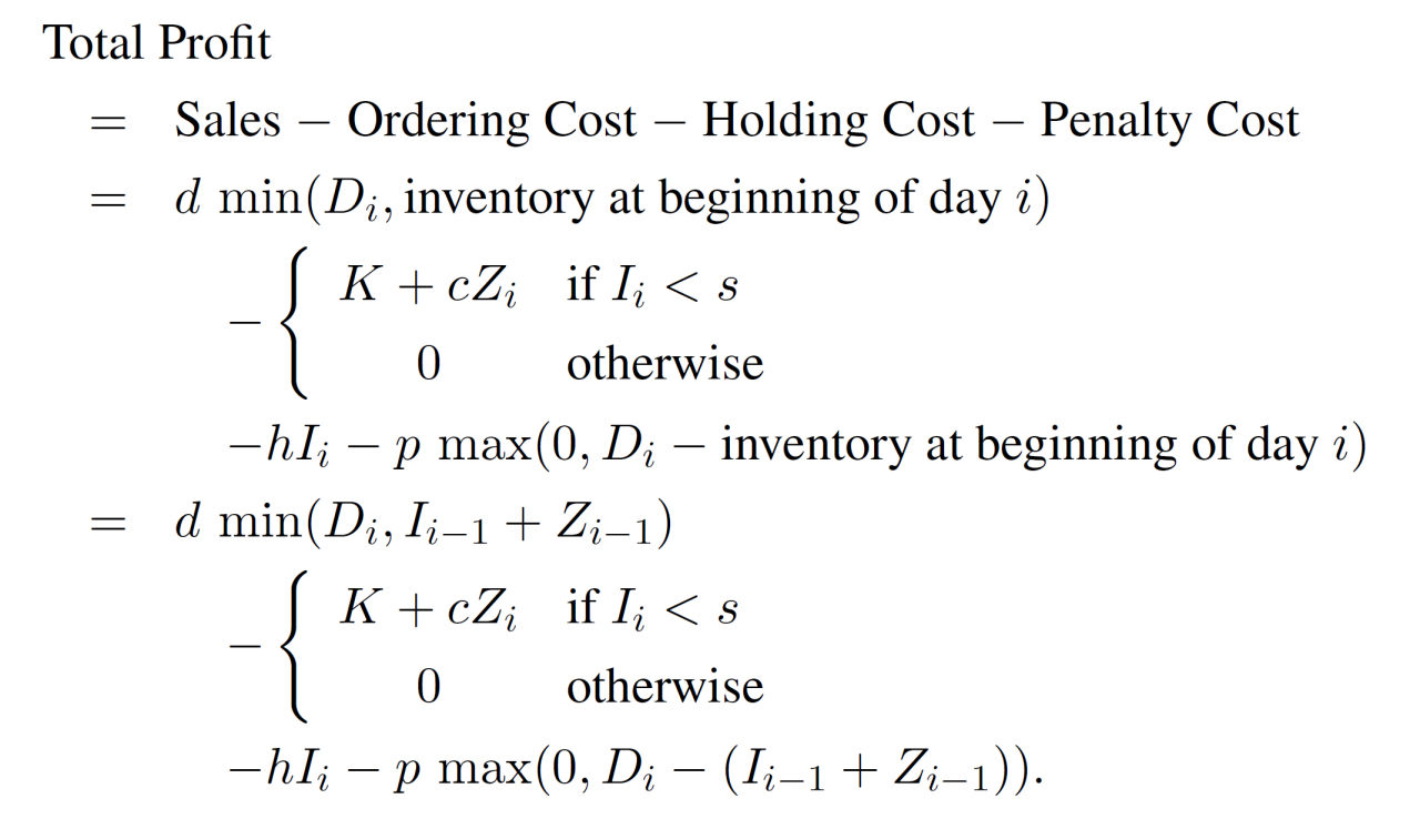 \[Z_i = \left\{ \begin{aligned} & S-I_i, & & \text{if} \ I_i < s \\ & 0, & & \text{otherwise} \end{aligned} \right.\]假设第$i$天进货的花费为$K+c Z_i$,每件商品在库存中的保管费用为$h$,商店的需求为$D_i$,如果当天库存量小于需求单位商品还会导致$p$的损失。在这些条件下我们可以建立商店的利润模型: