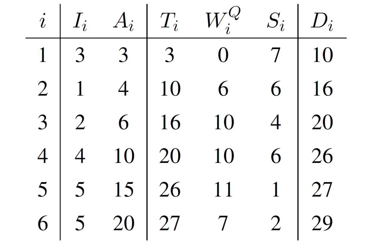 依据这些关系我们可以生成一个用户序列如下,通过模拟结果可以计算出用户的平均等待时间为$\frac{\sum_{i=1}^6 W^Q_i}{6} = 7.33$。