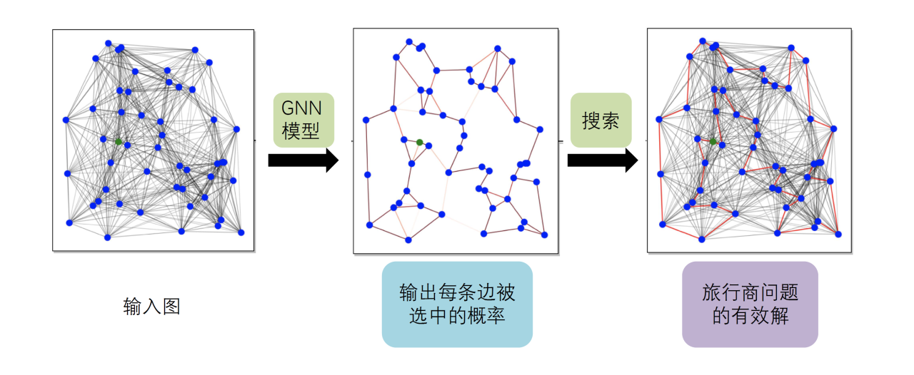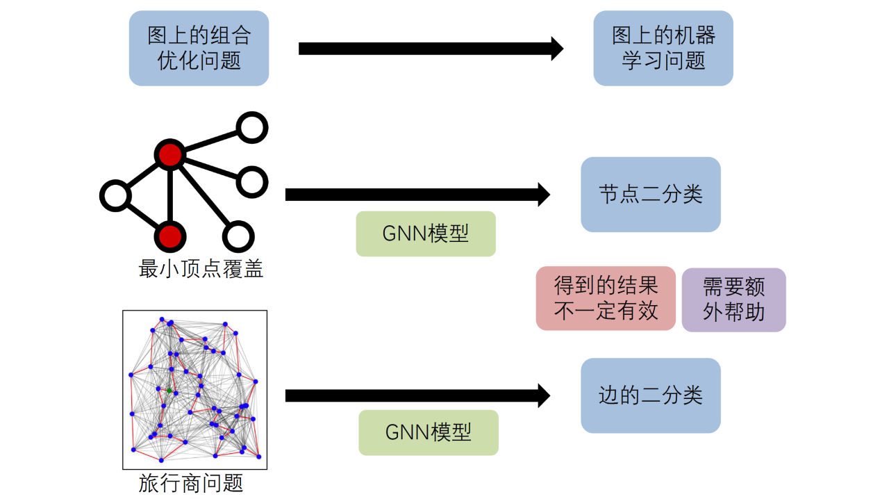 目前已经有研究人员尝试使用图神经网络来从给定的样本中学习这样的启发式算法,然后为未知的任务提供解。具体来说,我们首先需要把这样的组合优化问题转换成一个图机器学习问题,然后就可以利用图神经网络的框架来进行求解。对于最小顶点覆盖问题,我们可以把它建模成一个节点二分类问题;而旅行商问题则可以建模为一个边二分类问题。除了标准分类损失,使用图神经网络时往往还需要考虑问题自身的约束这样才能保证得到有效的解。