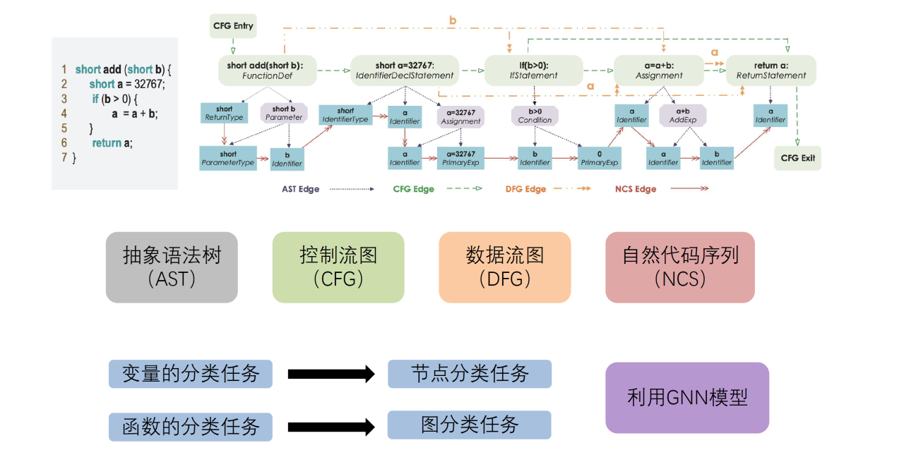 我们可以使用机器学习来实现对源代码的各种自动化任务,如变量名误用、漏洞检测等。目前常用的自动化方法是借助NLP的相关方法来处理源代码,而显然这类方法很难捕获代码中的语法和语义关系。近年来研究人员尝试使用图来表示代码然后利用图神经网络来学习其表示以用于下游任务。