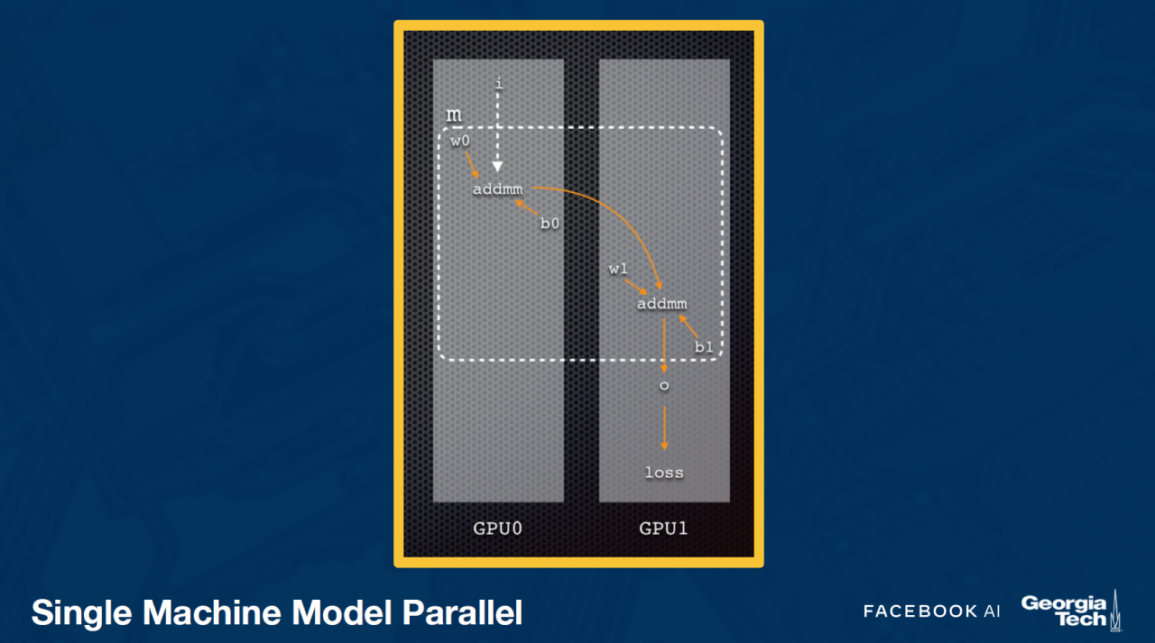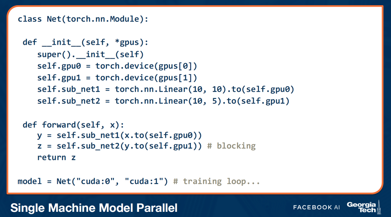对于single machine model parallel的情况,我们需要在定义模型时将不同的部件分配到不同的GPU上同时在定义前向传播时指定数据所在的GPU。