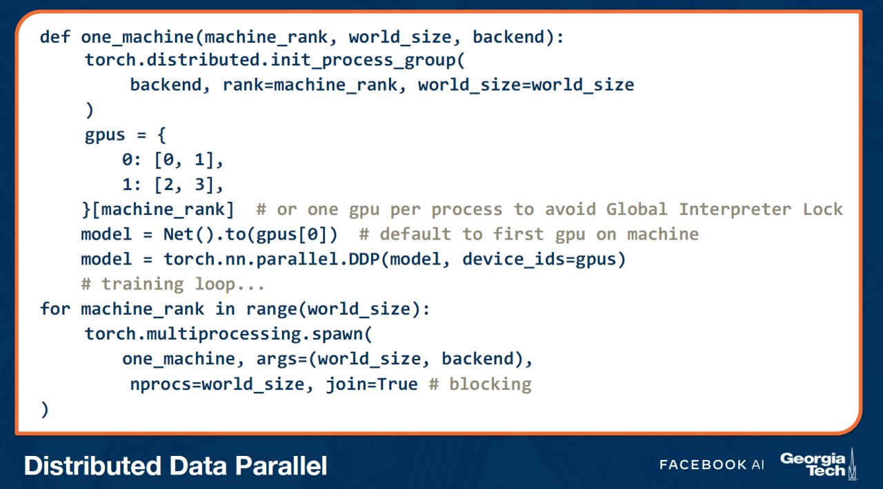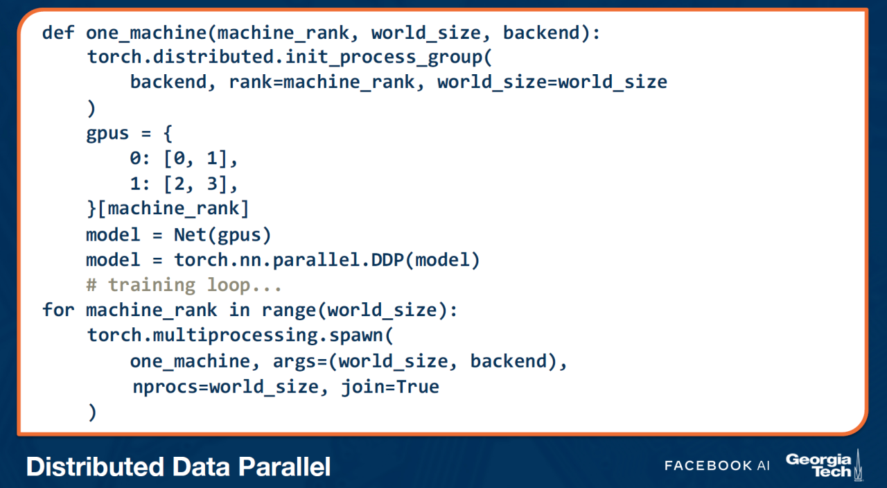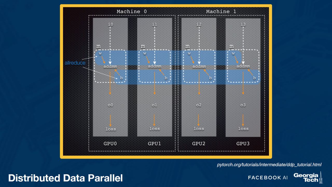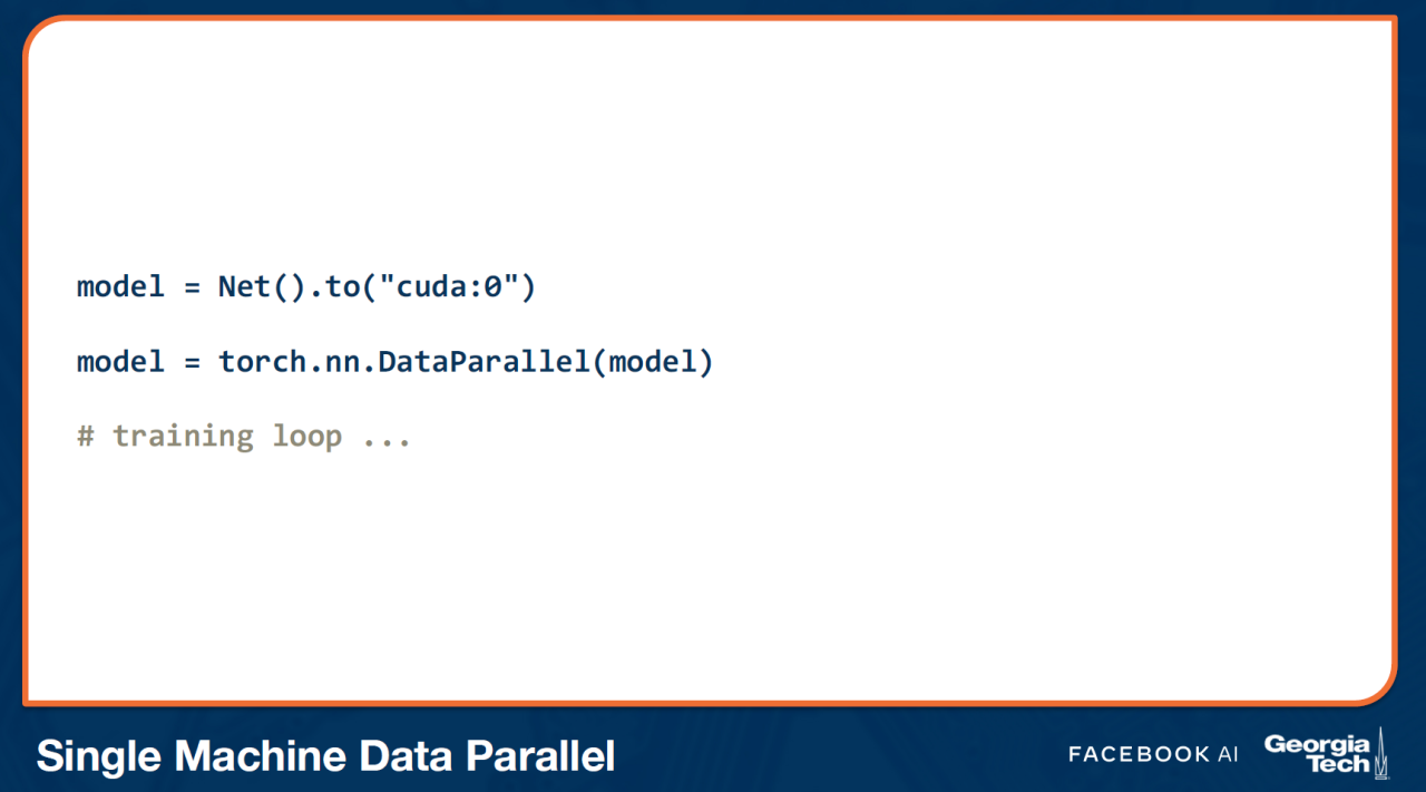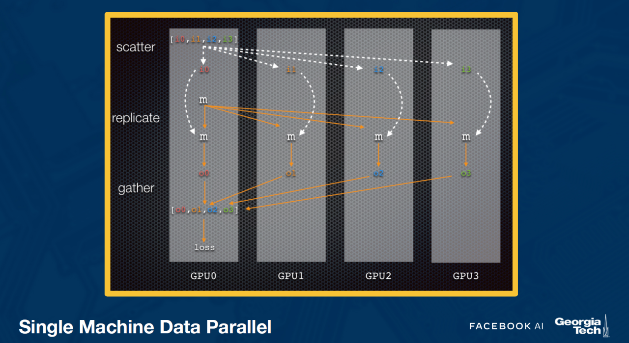 最基本的情况是single machine data parallel。此时我们需要把一个batch的数据分配到不同的GPU上独立计算输出,然后由某个GPU收集计算出的数据并计算损失。