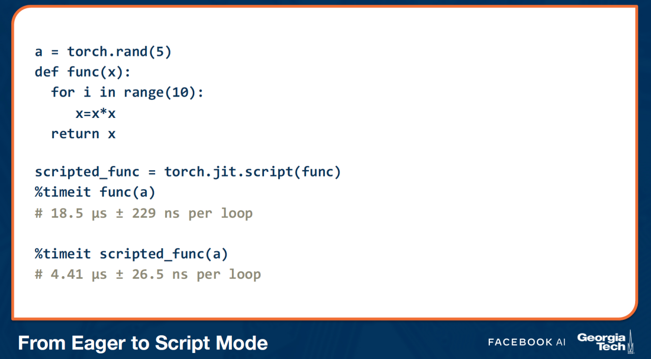 默认情况下PyTorch使用eager mode来执行代码,eager mode适合在编写代码时进行调试但通常会损失一些性能。如果想要提升性能可以主动切换到script mode作为运行环境。