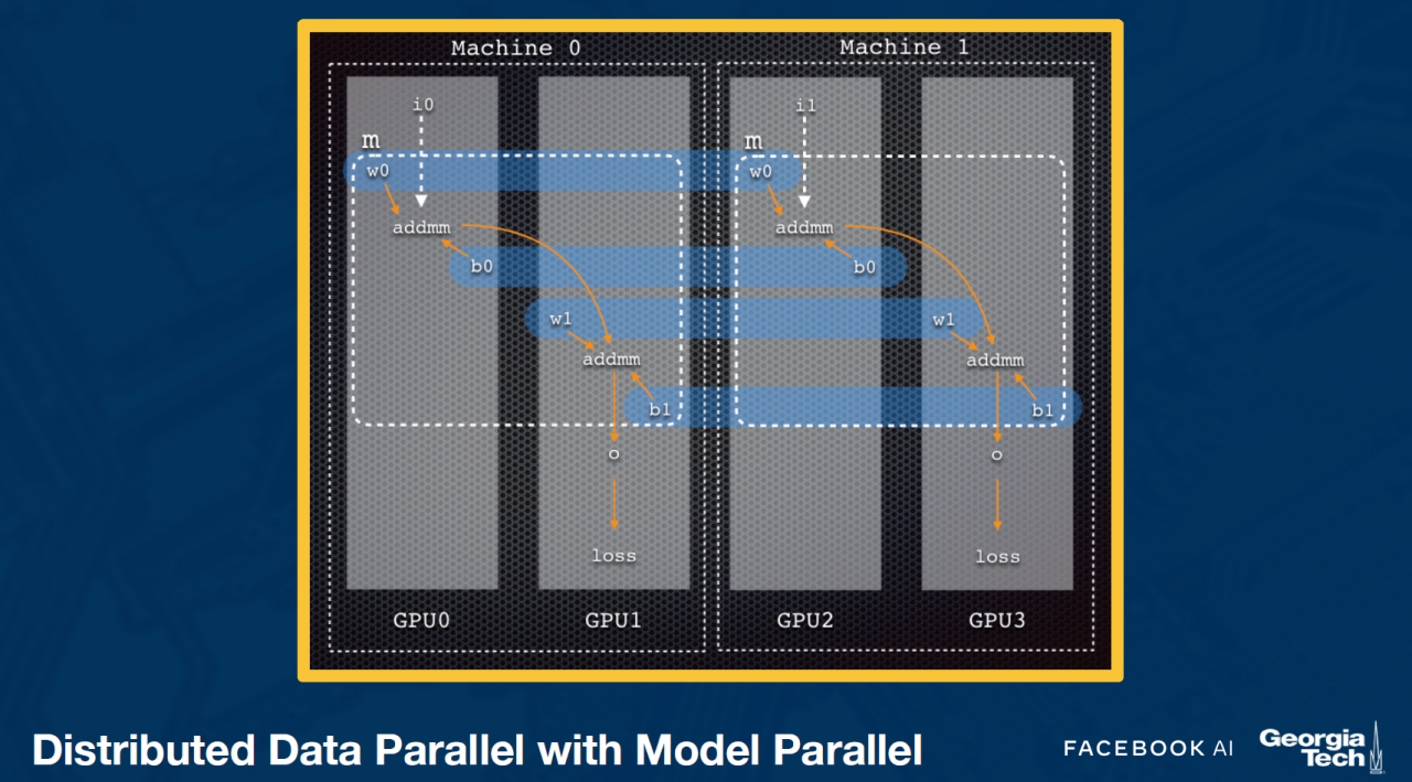 把data parallel和model parallel结合到一起就得到了distributed data parallel with model parallel,此时数据和模型都处于不同机器的不同GPU上。