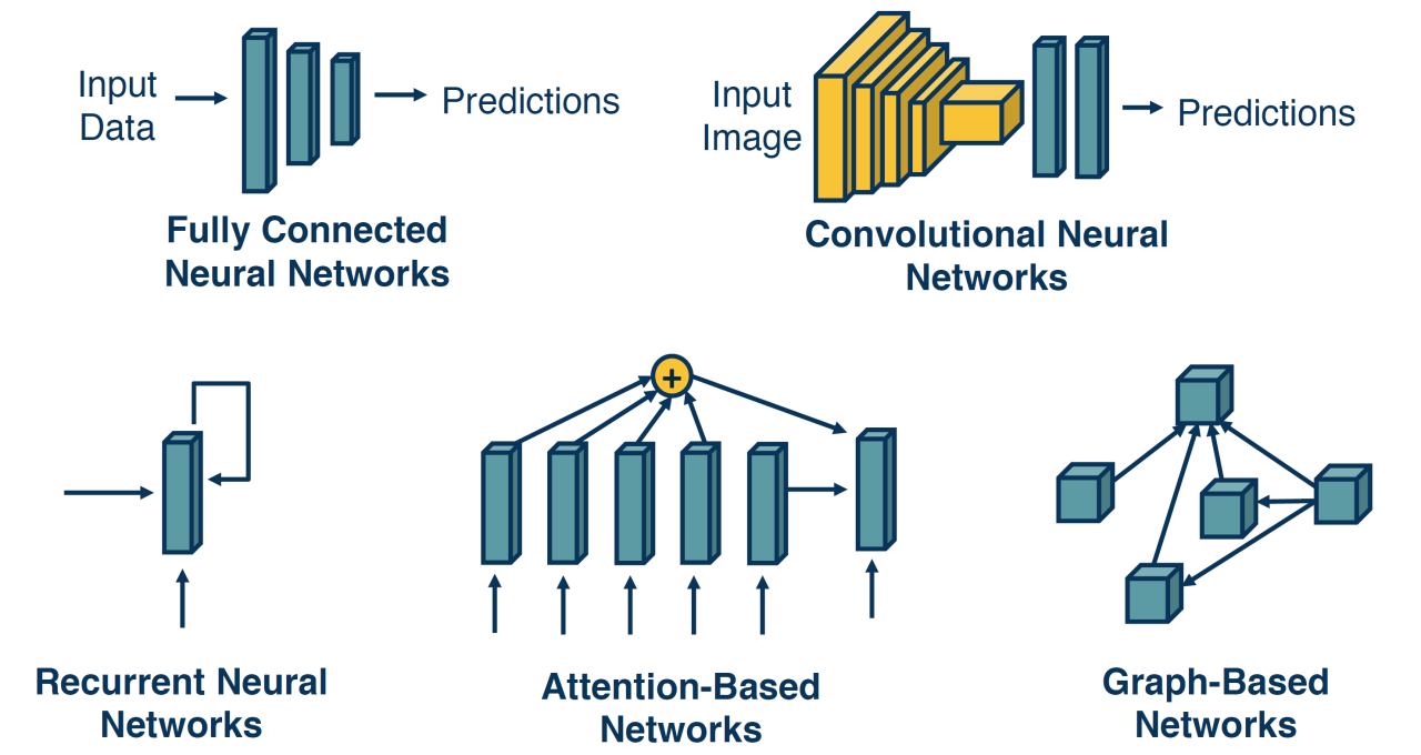 为了适应这些更加复杂的结构关系,人们在标准神经网络的基础上还开发出了循环神经网络(Recurrent Neural Networks, RNN)、注意力网络(Attention-Based Networks)以及图神经网络(Graph Neural Networks, GNN)等更加复杂的网络形式。