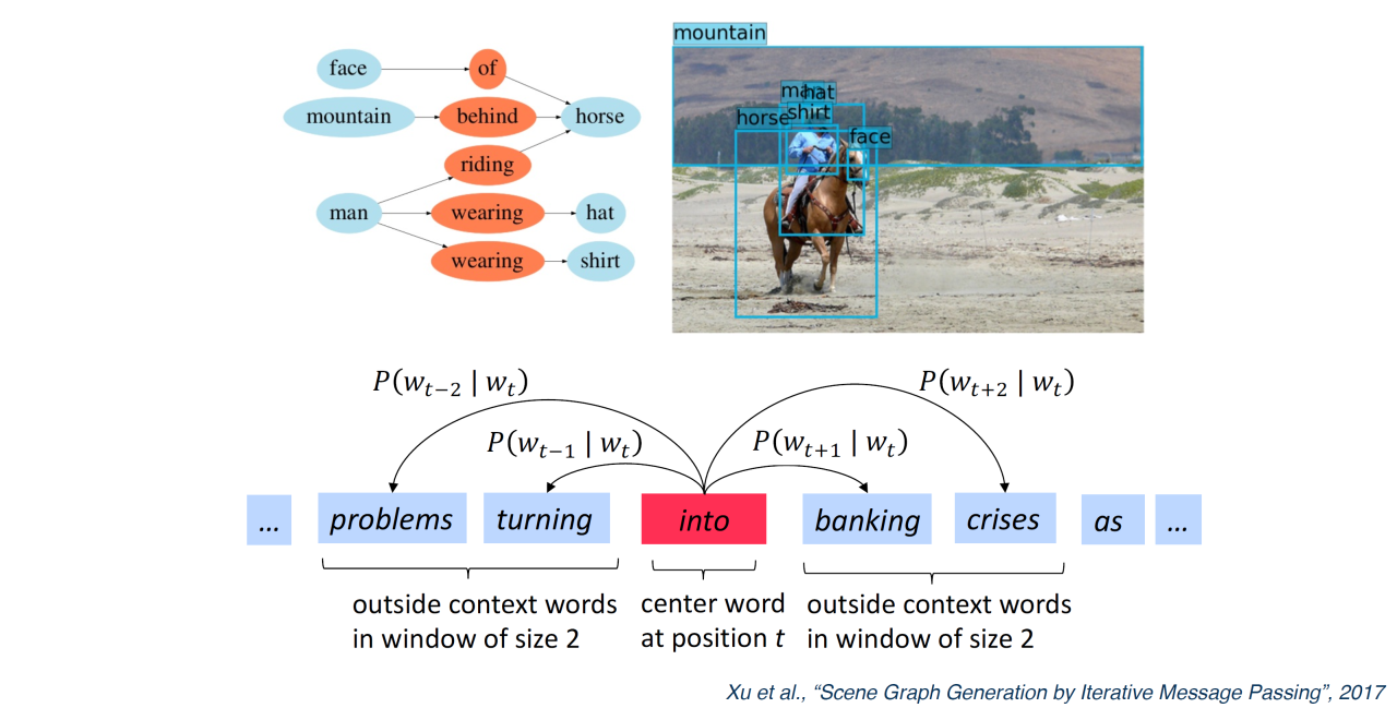 实际上这样的结构化特征是非常常见的。对于一张图像我们可以将图像中的物体用图的方式来描述它们之间的关系;对于一个句子来说不同词之间的语义和语法关系也可以用图结构来进行描述;甚至对于知识和概念本身也可以用类似的形式进行表达。