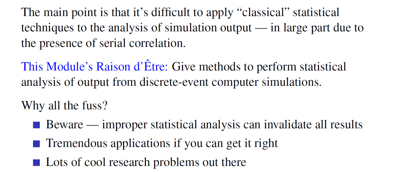 这个系列是Gatech OMSCS 仿真和建模课程(ISYE 6644: Simulation and Modeling for Engineering and Science)的同步课程笔记。课程内容涉及计算机模拟在统计分析和建模中的应用,本节介绍对随机模拟的输出结果进行分析的方法。