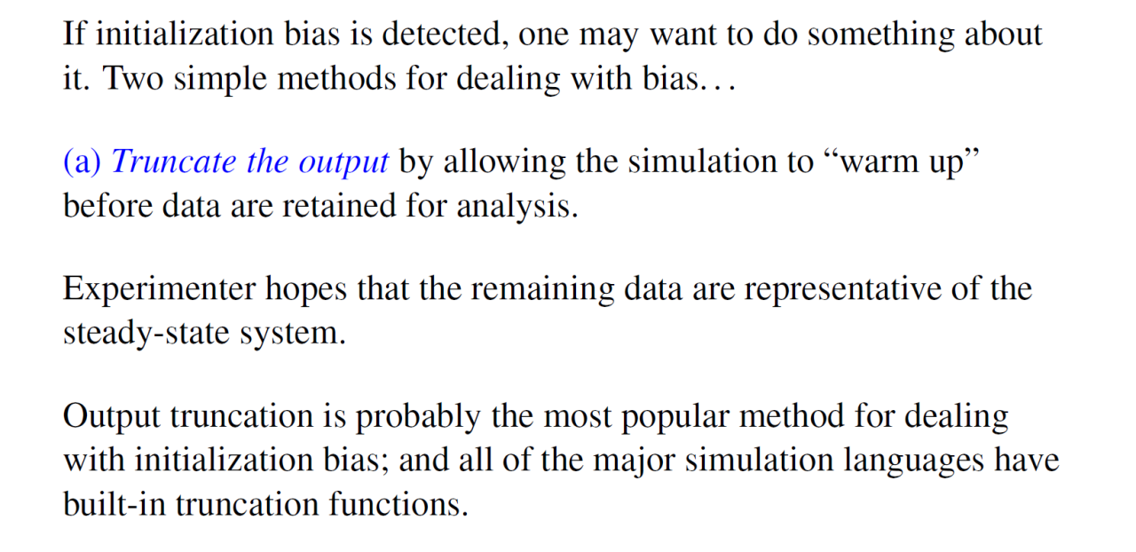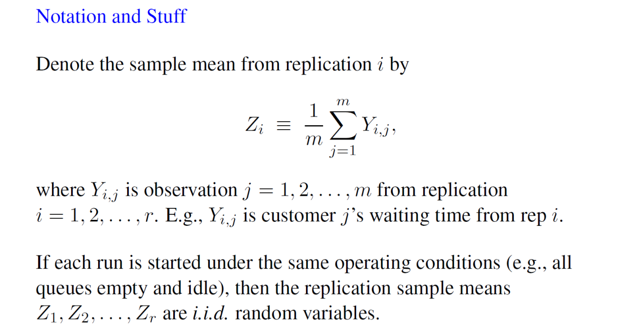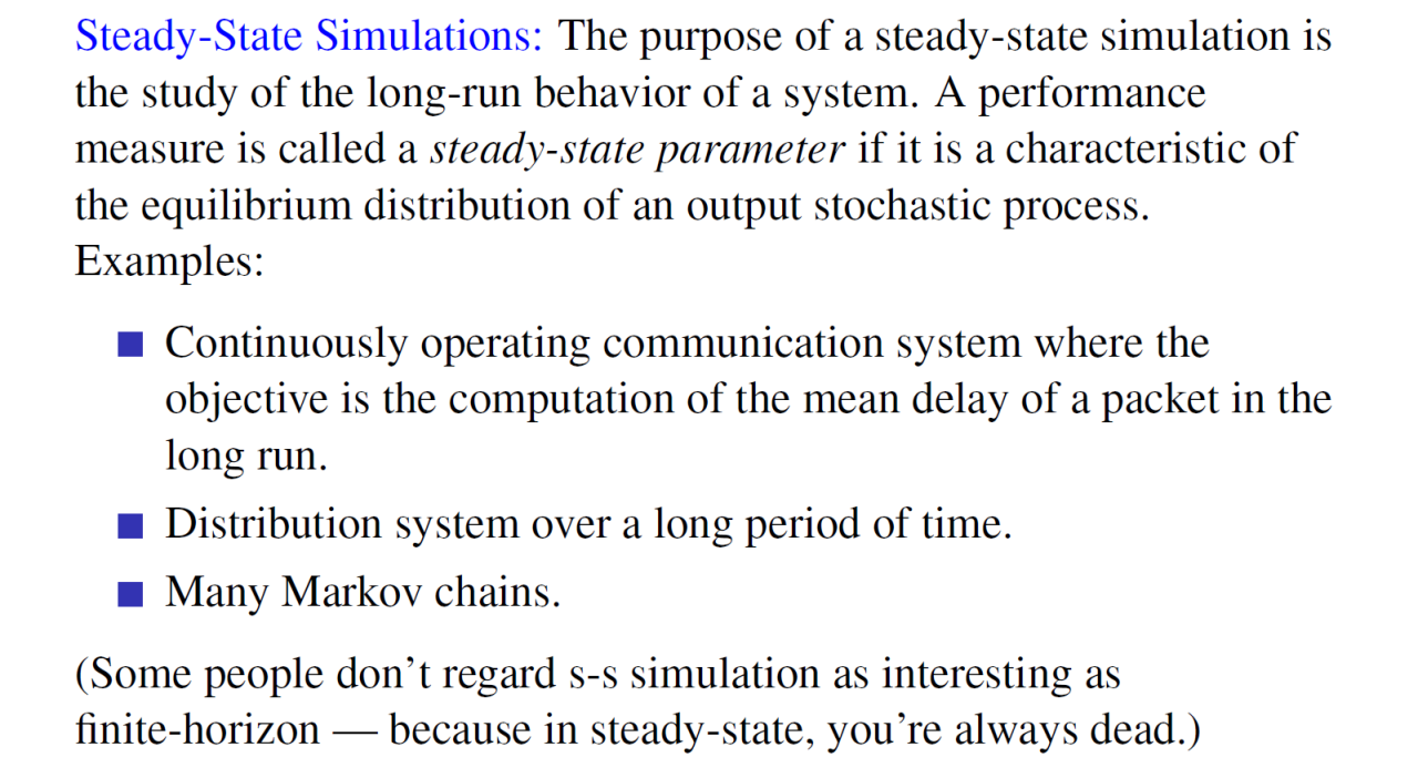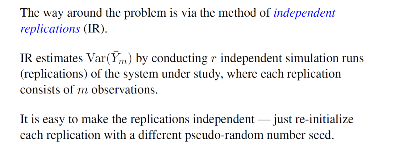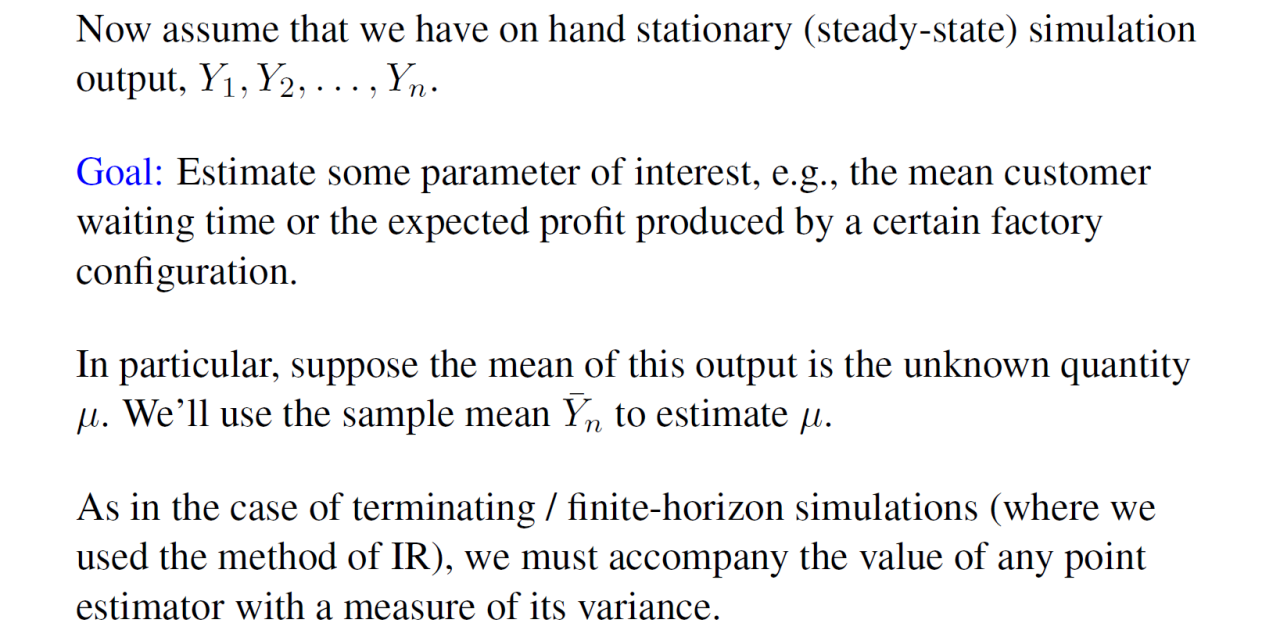 在steady-state analysis中我们关心系统的长期行为,这里我们借用finite-horizon simulation中独立重复试验的一些概念来进行参数估计。