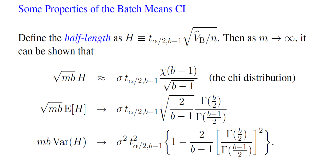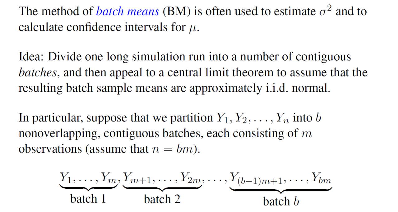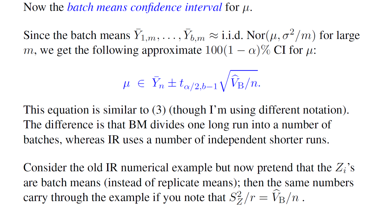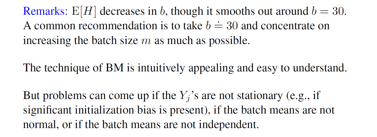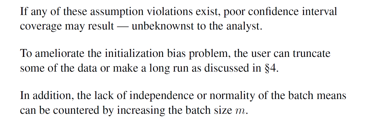 我们同样可以计算均值$\mu$的置信区间,从形式上看它和finite-horizon simulation并没有什么区别。但需要注意的是finite-horizon simulation是通过独立重复试验来进行计算,而steady-state analysis则是把一个长的序列划分为batch进行计算。
