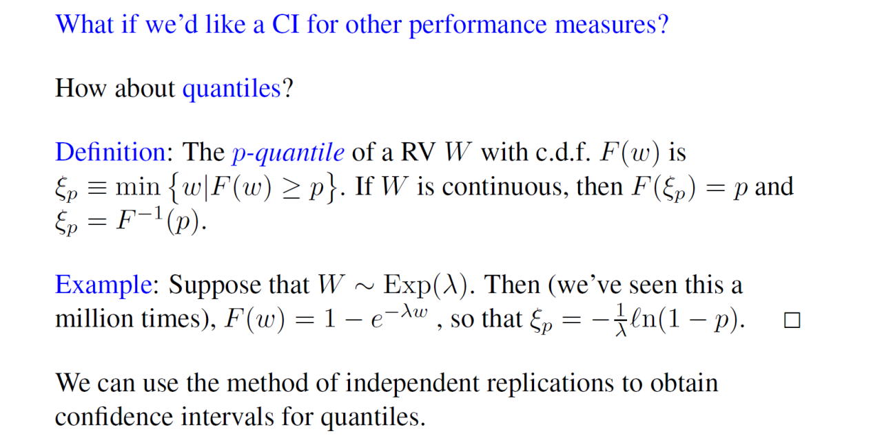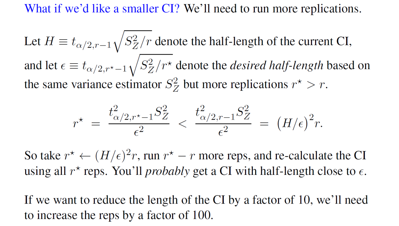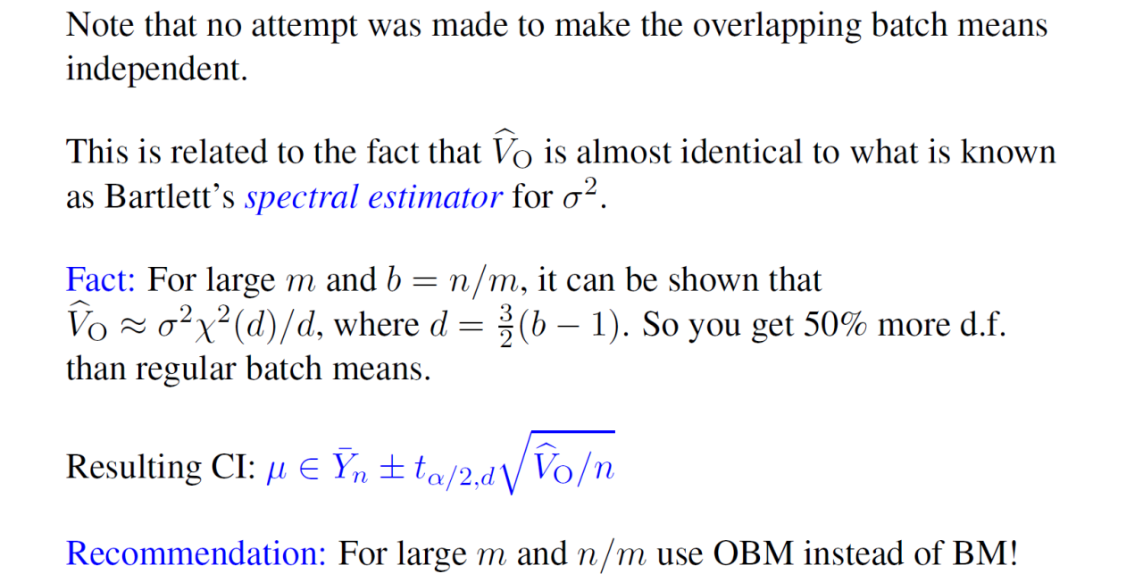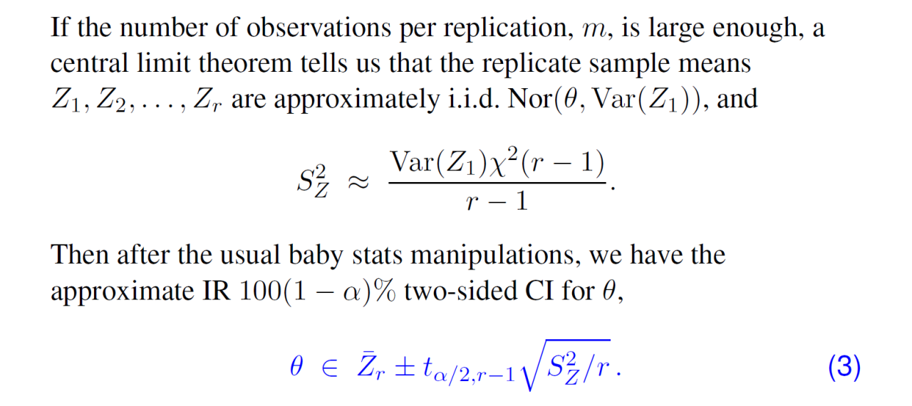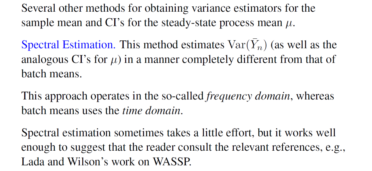 我们同样可以计算均值$\mu$的置信区间,从形式上看它和finite-horizon simulation并没有什么区别。但需要注意的是finite-horizon simulation是通过独立重复试验来进行计算,而steady-state analysis则是把一个长的序列划分为batch进行计算。