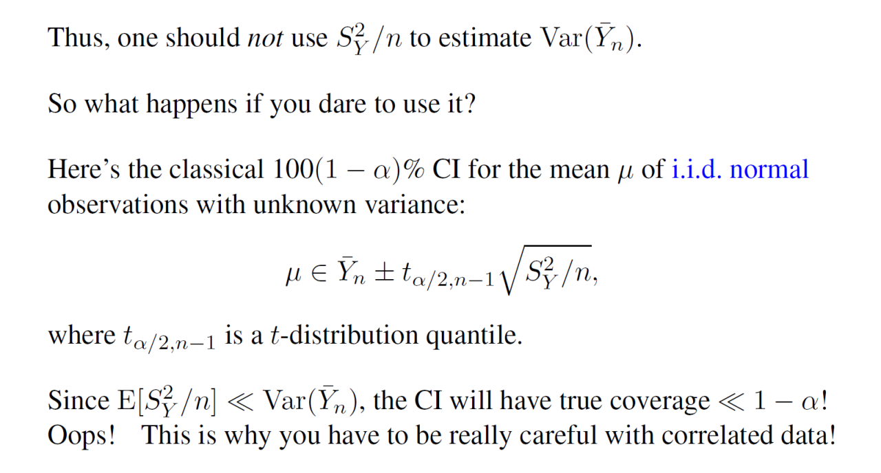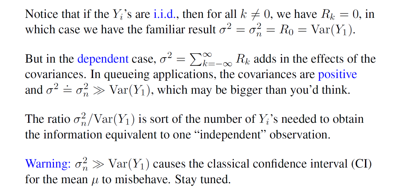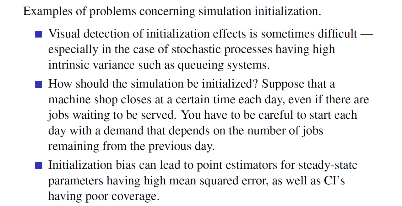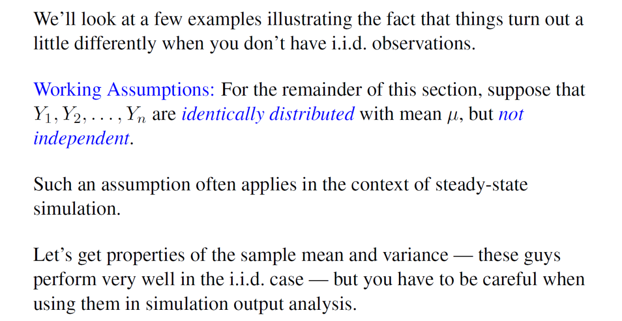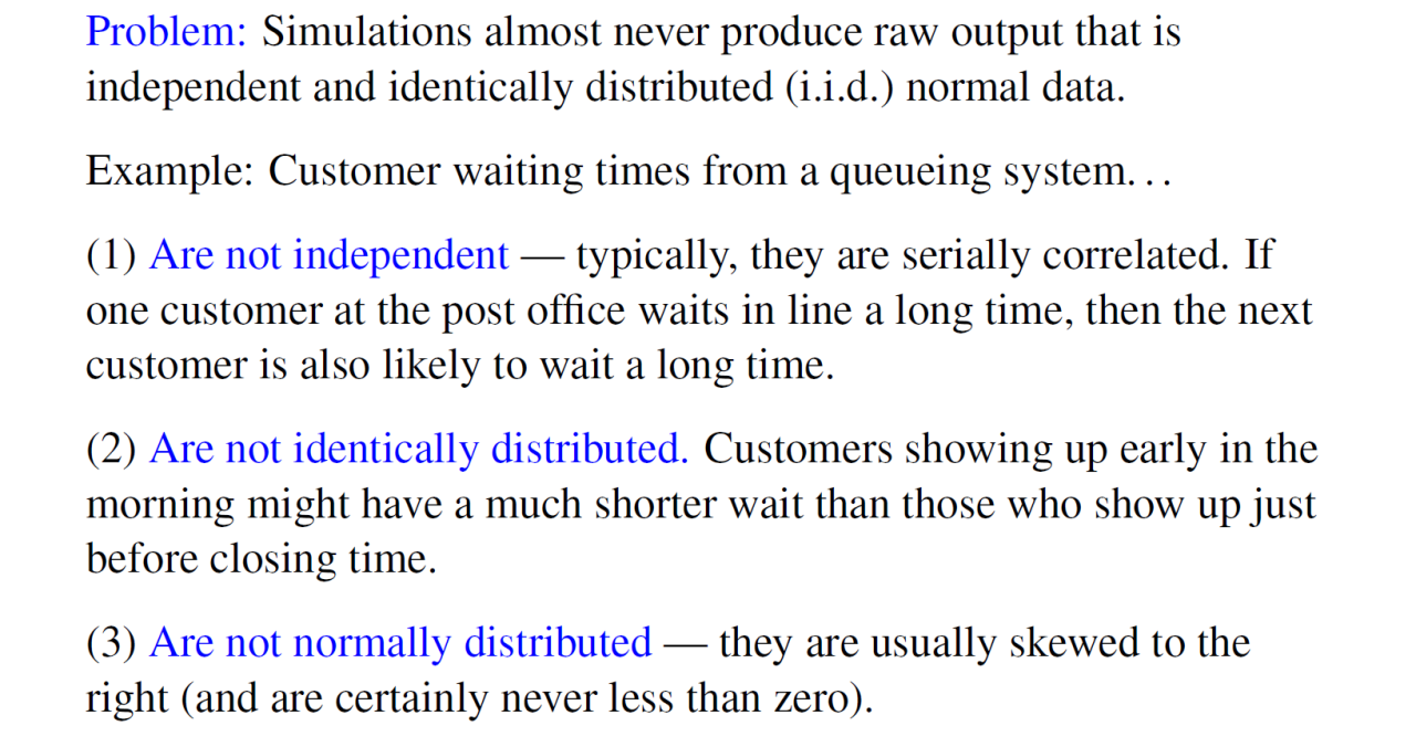 输出结果分析的难点在于样本之间往往是不满足独立同分布假定的。以排队问题为例,相邻用户之间的等待时间显然是相互关联的。在这种情况下之间套用一些常用的估计方法会导致额外偏差。